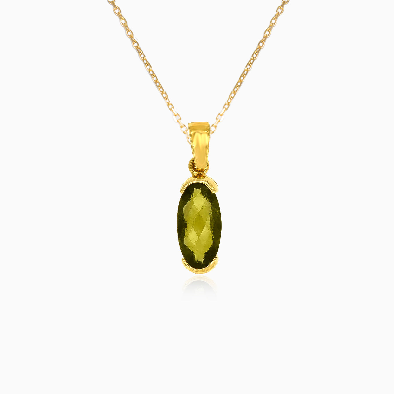 Golden Horizon: Colgante de oro amarillo de 14 quilates con engaste en barra y moldavita ovalada de corte escalonado fino