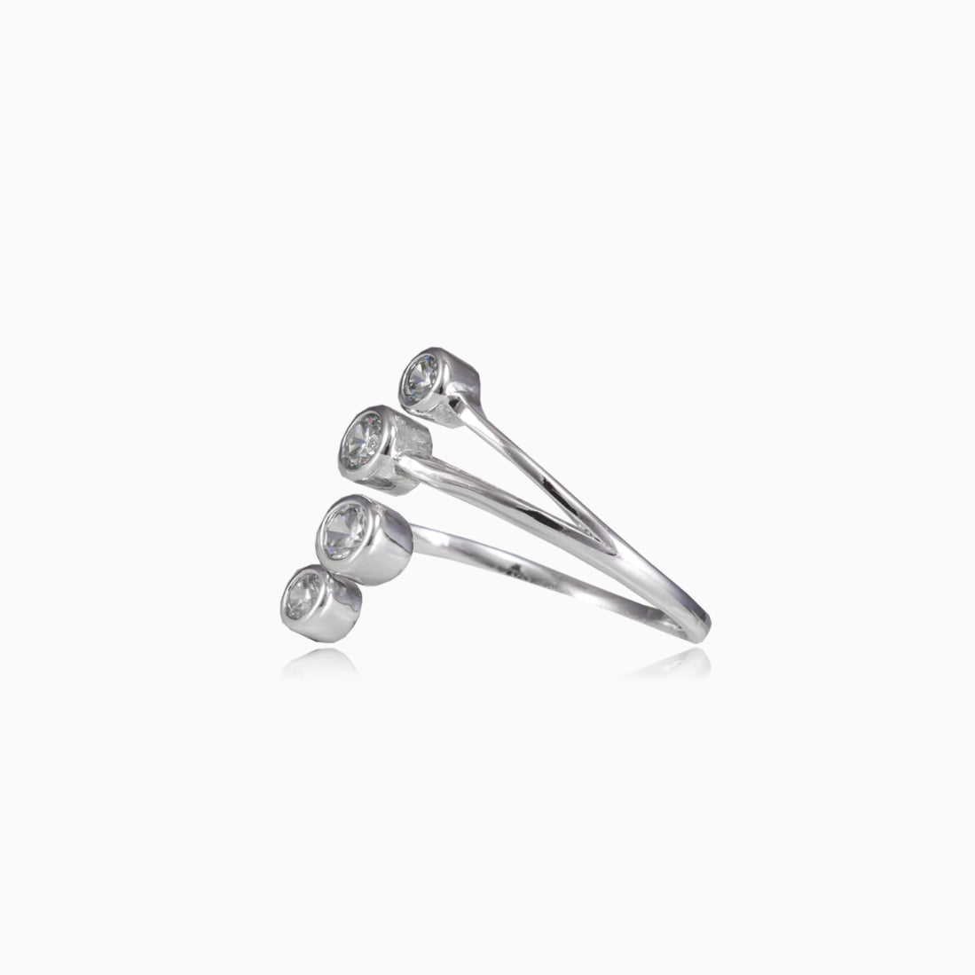 Anillo ajustable de plata esterlina combinado con cuatro zirconias cúbicas redondas aseguradas en engaste de bisel.