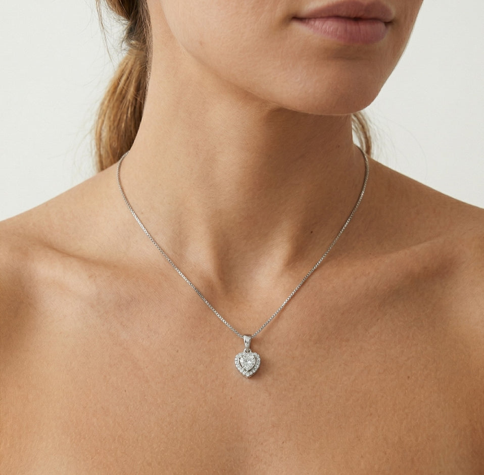 Colgante de corazón real de plata de ley combinado con circonita cúbica central y halo de circonitas cúbicas alrededor.