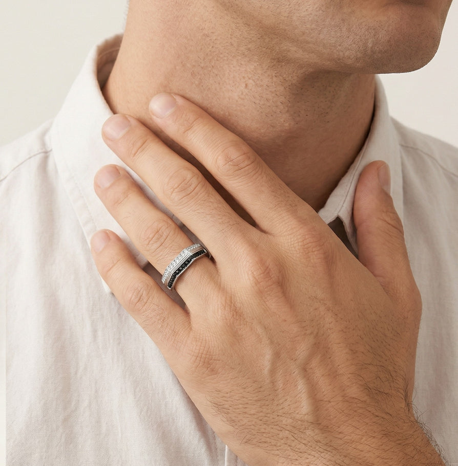 Tento pánský prsten ze stříbra kombinuje tmavý onyx s jiskřícími kubickými zirkony, které jsou uspořádány do dvou elegantních řad. Robustní tvar a precizní zpracování dodávají šperku sebevědomý a moderní vzhled. Ideální pro muže, kteří hledají výrazný a sofistikovaný doplněk.