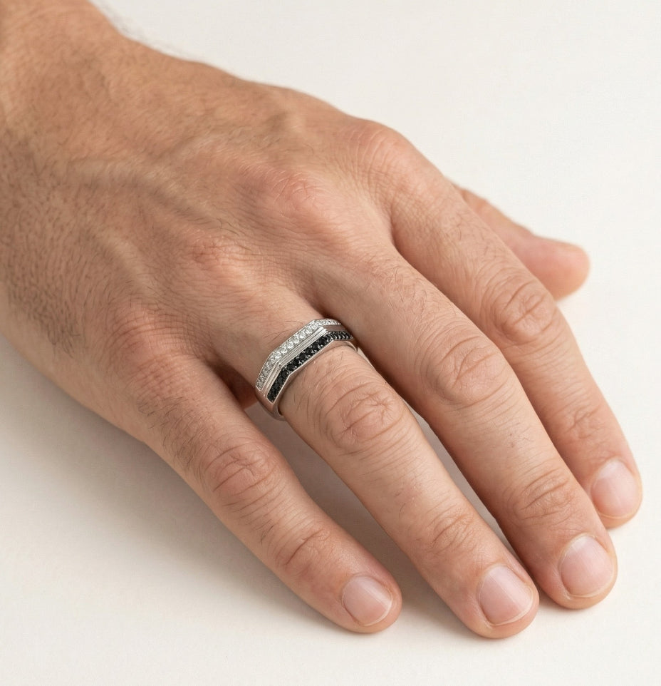 Pánský prsten s onyxem a kubickými zirkony, dvojité řady kamenů