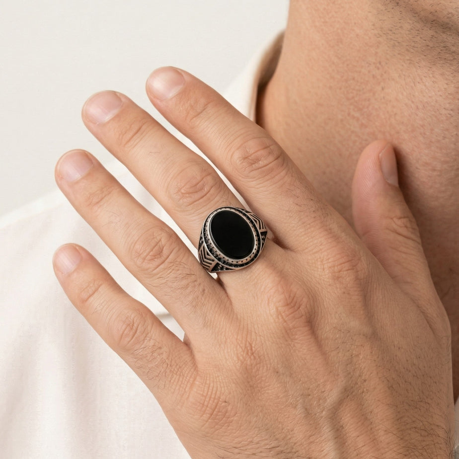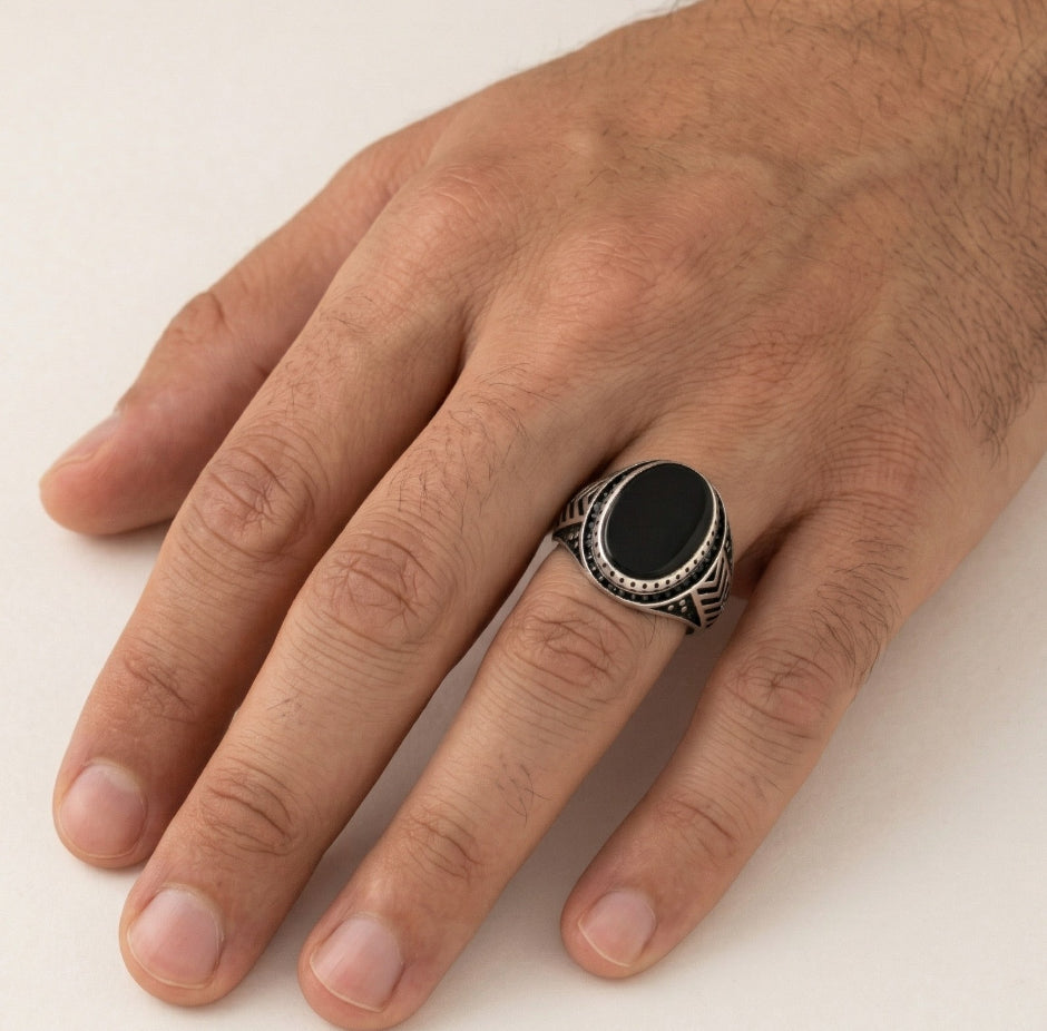Pánský prsten s oválným onyxem a detailními liniemi