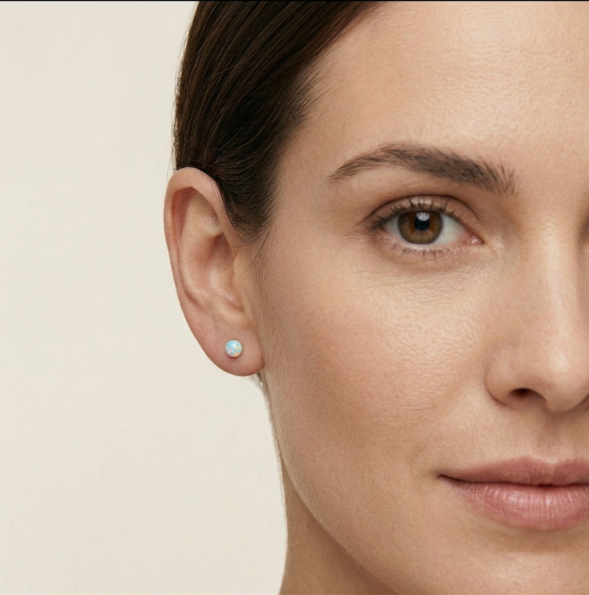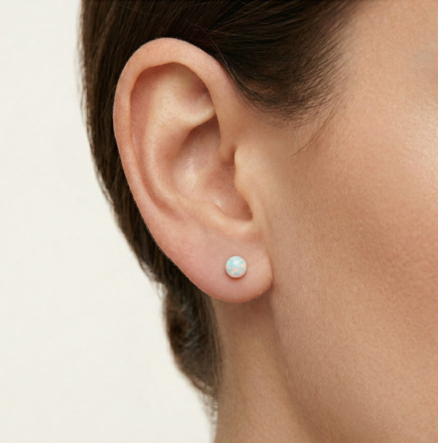 Bola de ópalo pulida de alto brillo combinada con pendiente de botón en plata de ley para mujer.