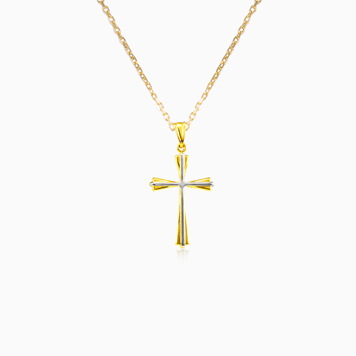 Confeccionado en oro blanco y amarillo de 14kt, este elegante colgante de cruz presenta un acabado detallado y delicado en oro blanco, creando un contraste perfecto entre los dos colores.