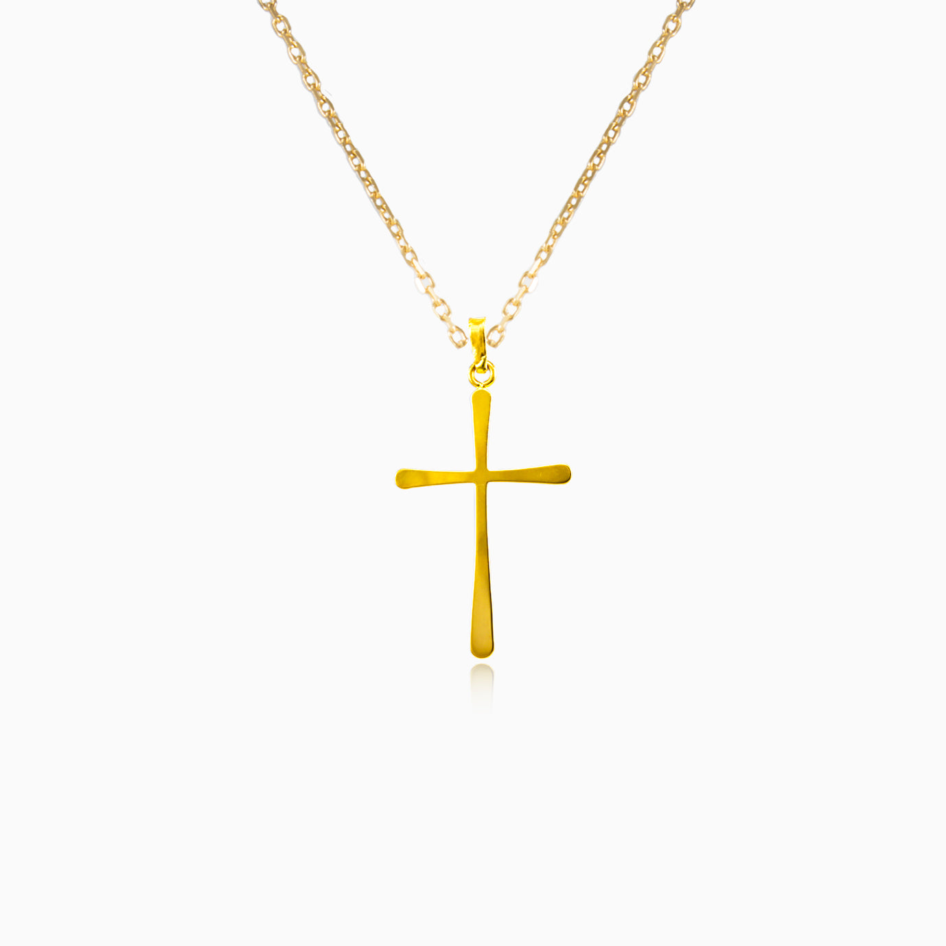 Este colgante presenta un diseño minimalista de una cruz de oro de 14kt.