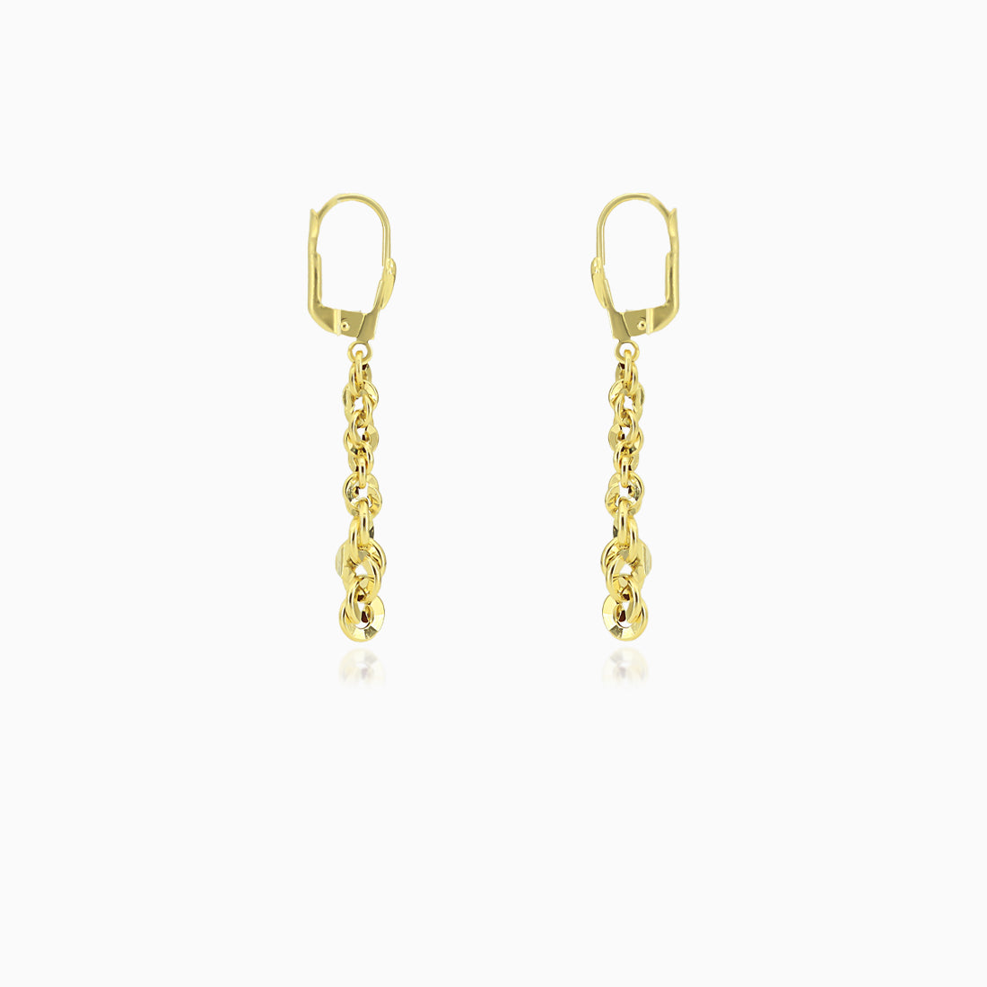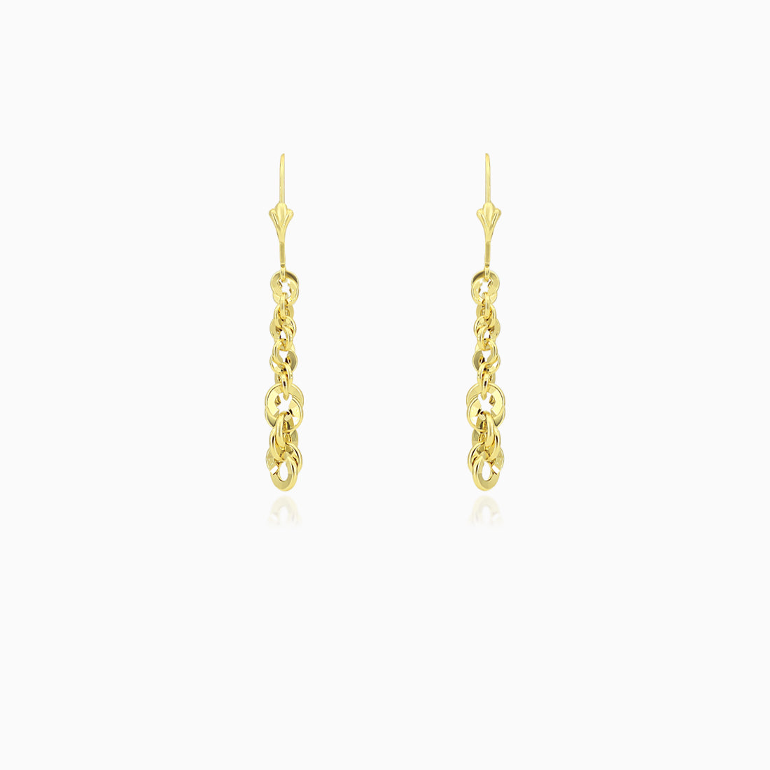 Pendientes colgantes para mujer en oro amarillo de 14 quilates con un diseño único de cadena Brillo Valis. Estos elegantes pendientes, fabricados sin piedras, cuentan con un cierre de palanca para un ajuste seguro. Un accesorio minimalista y elegante, perfecto tanto para ocasiones informales como formales.