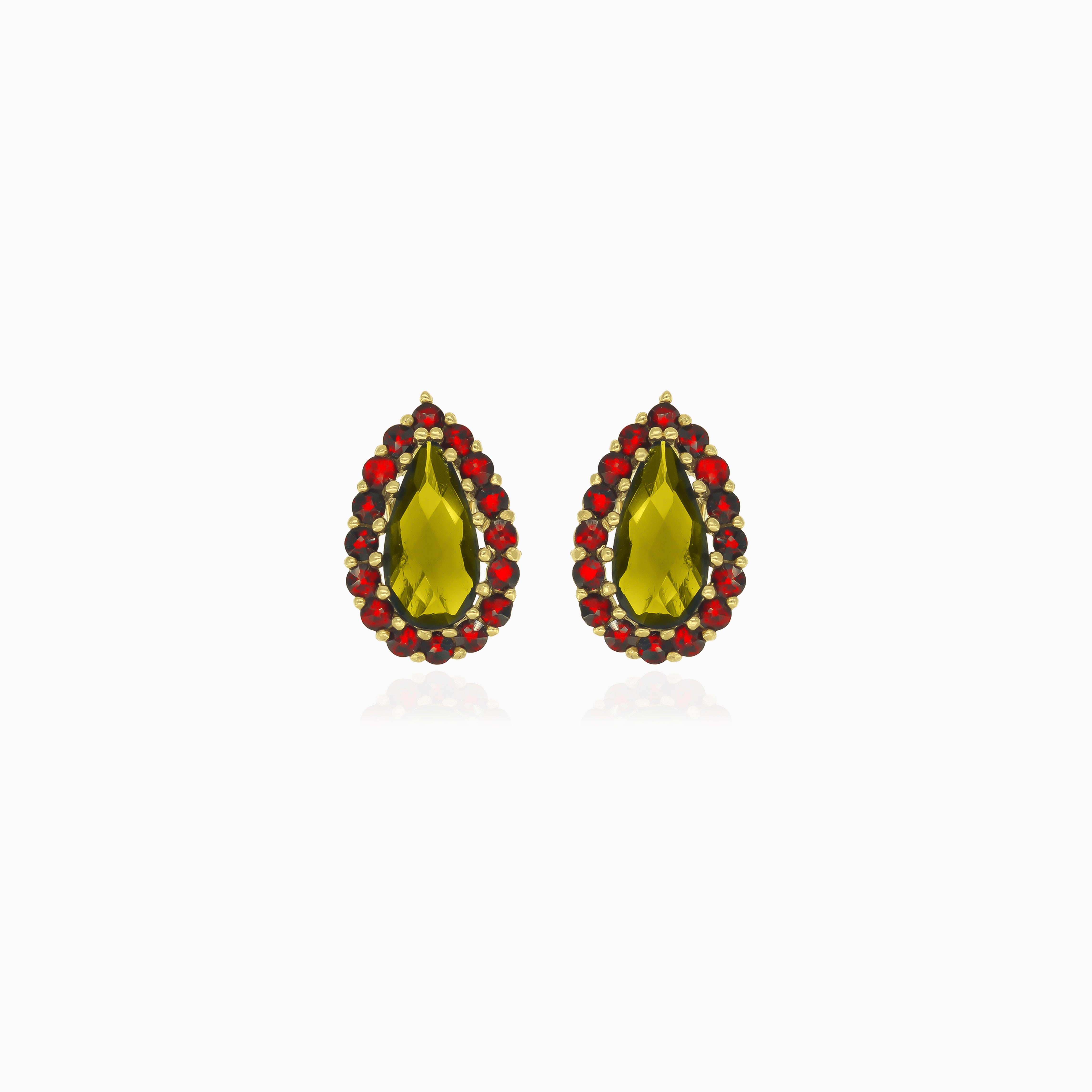Pendientes colgantes Majestic Harmony en oro con moldavita en forma de pera y granate redondo