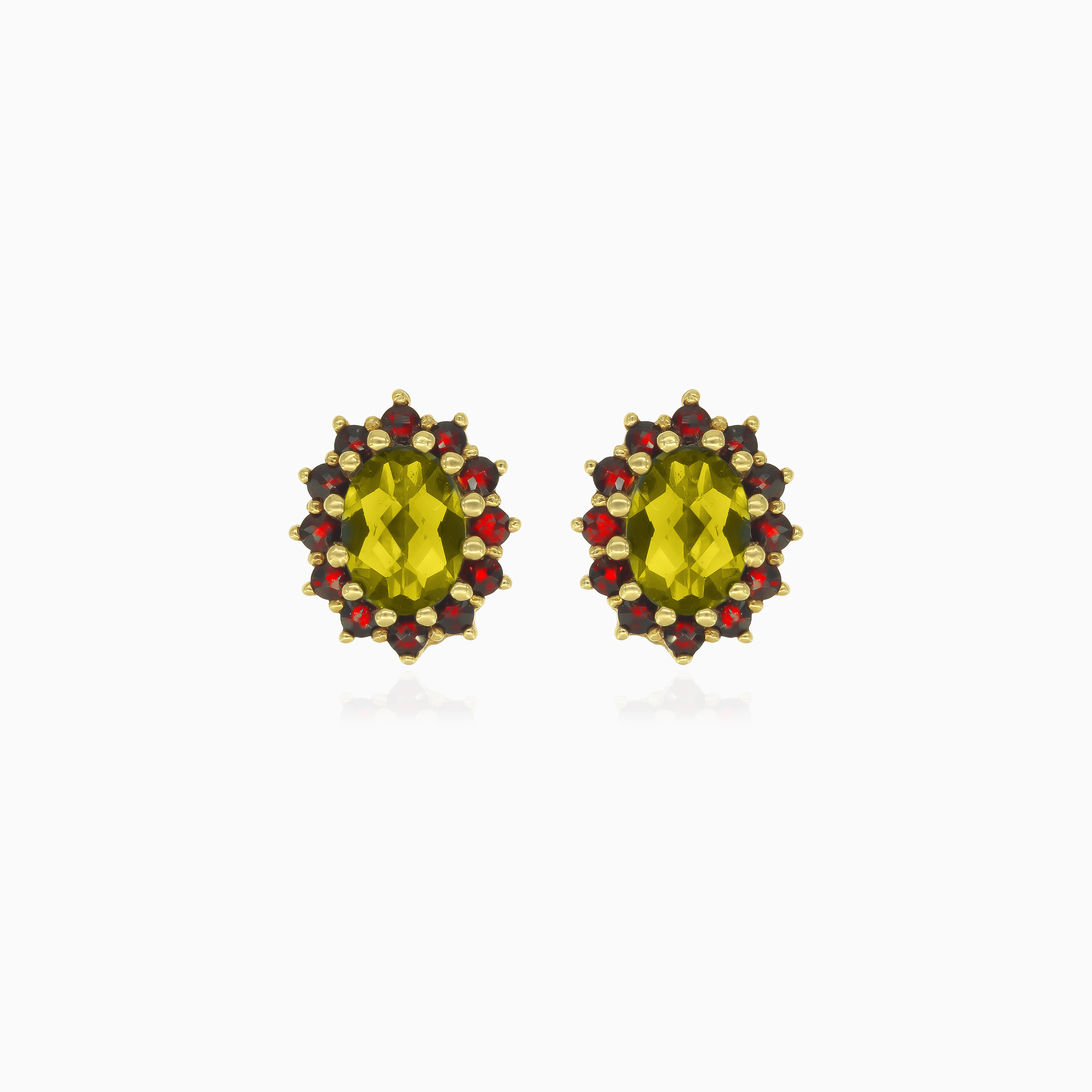 Pendientes colgantes Royal Radiance de oro con moldavita corte ovalado y granate piedra redonda