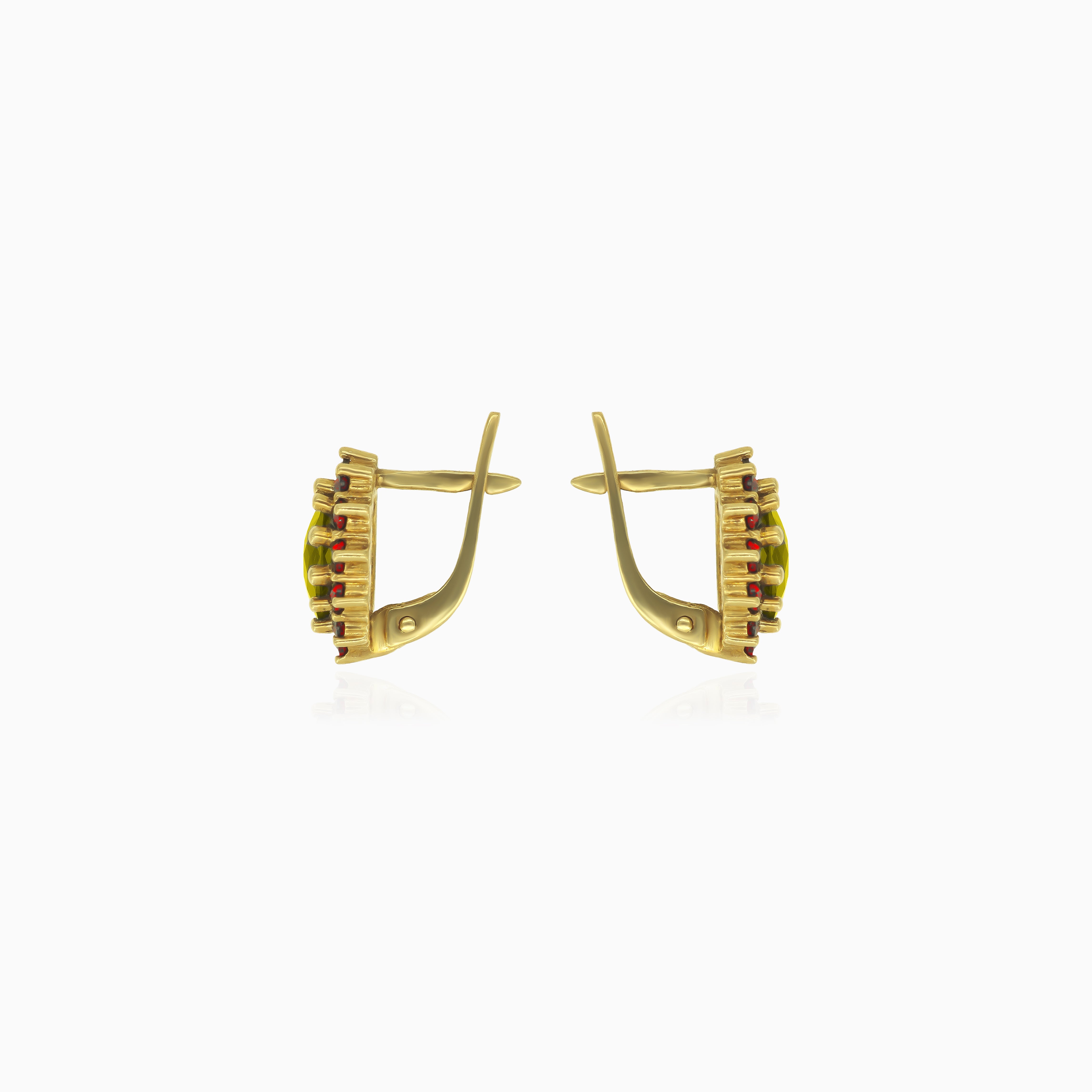Disfruta de la opulencia de los pendientes colgantes Royal Radiance. Elaborados en oro amarillo de 14 quilates, esta pieza real presenta una cautivadora moldavita corte ovalado, una vibrante piedra granate redonda y está asegurada por un intrincado engaste de 12 garras y cierre de bisagra, añadiendo un toque de lujo a tu colección de joyas.