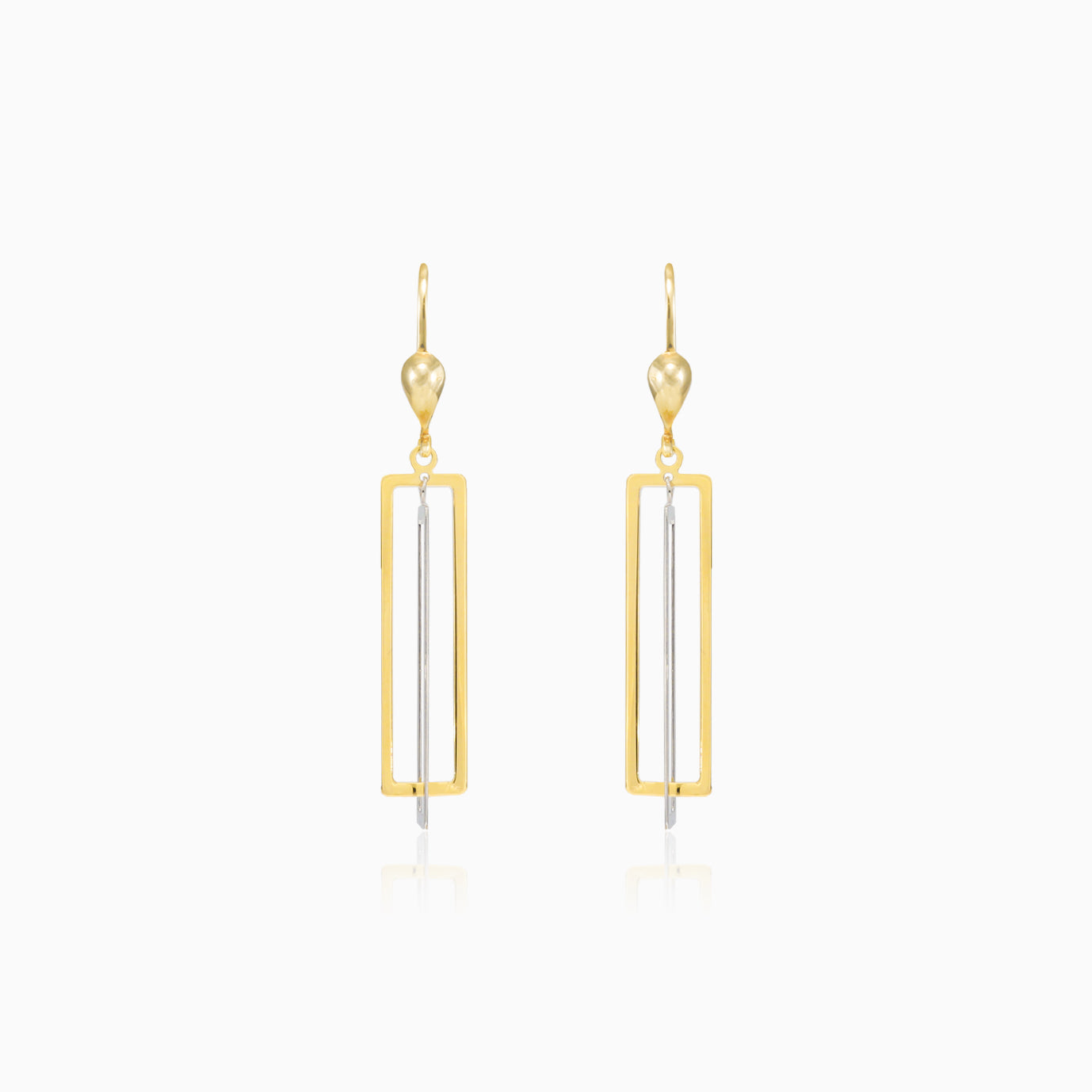 Estos pendientes largos de oro de 14 quilates presentan dos líneas rectangulares, una en oro blanco y otra en oro amarillo, creando un diseño elegante y moderno.