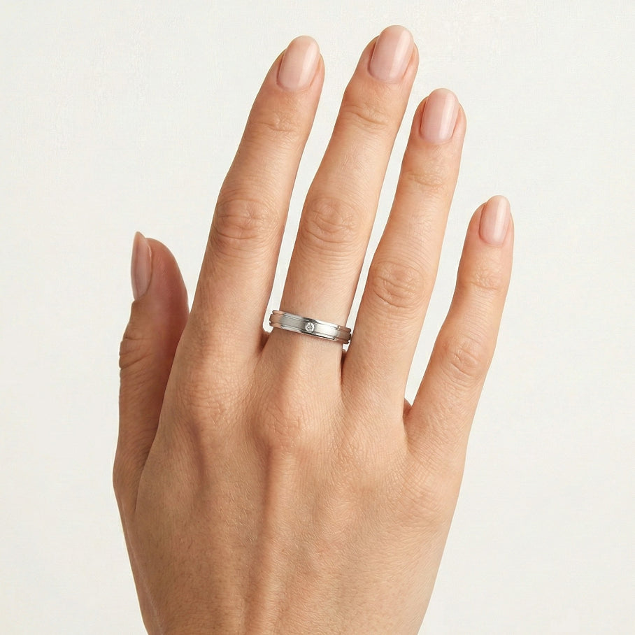 Este exquisito anillo de boda para hombres y mujeres está fabricado en oro blanco de 14 quilates con un grosor de 5 mm. Ofrece la opción de un zirconia cúbica o un diamante de 0.03 ct en corte fino redondo. Disponible en diseño de acabado pulido o mate, con opciones de engaste solitario de bisel o aro liso.