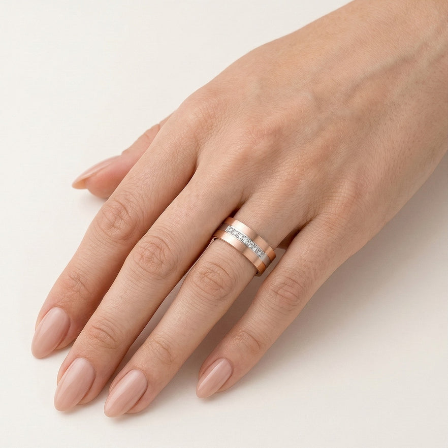 Descubre la combinación perfecta de elegancia y sofisticación con nuestros anillos de boda de oro rosa y blanco de 14 quilates para hombres y mujeres. El primer anillo cuenta con una zirconia cúbica o diamante opcional de 0,14 ct en corte fino escalonado redondo con engaste de garras. El segundo anillo es liso, de 8 mm de grosor, con acabado mate y pulido, simbolizando la unidad y la belleza atemporal.
