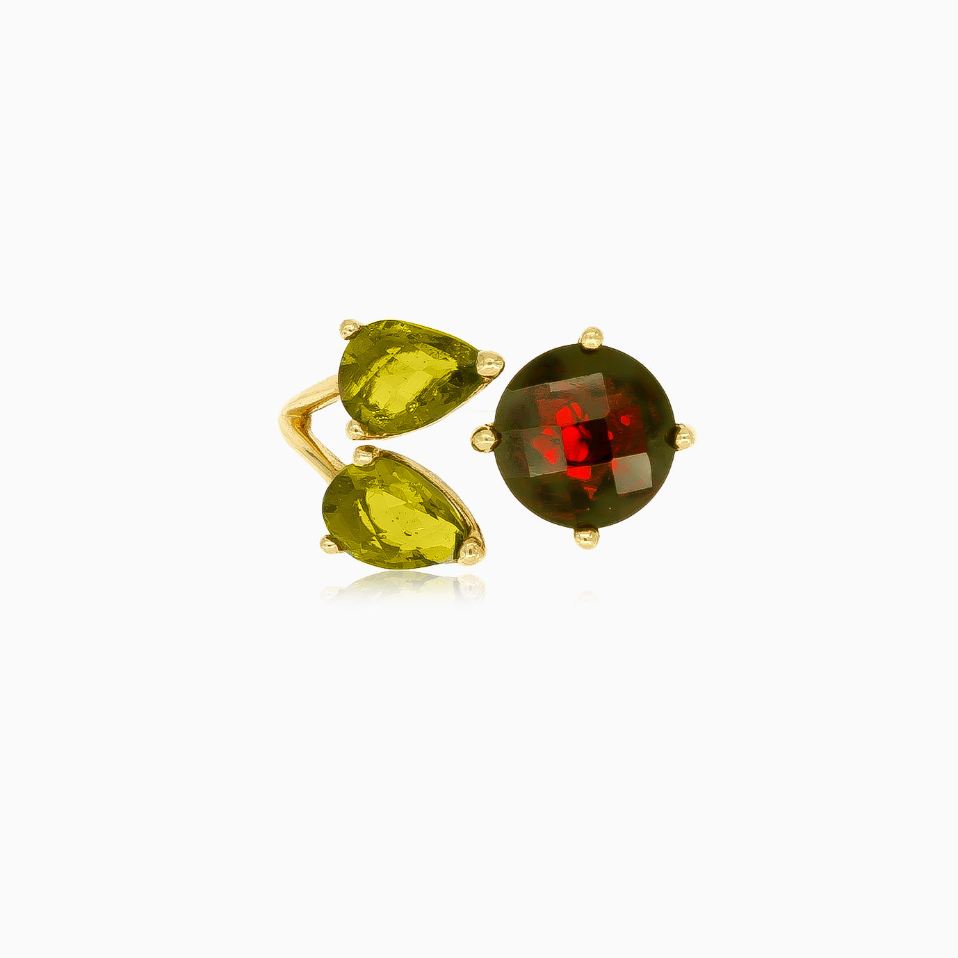 Abraza el encanto de nuestro anillo para mujer con moldavita en corte fino pera y engaste delicado de 3 garras, y granate redondo en corte fino con engaste seguro de 4 garras. Elaborado en oro amarillo de 14 quilates, adornado con un encantador detalle de flor rosa.
