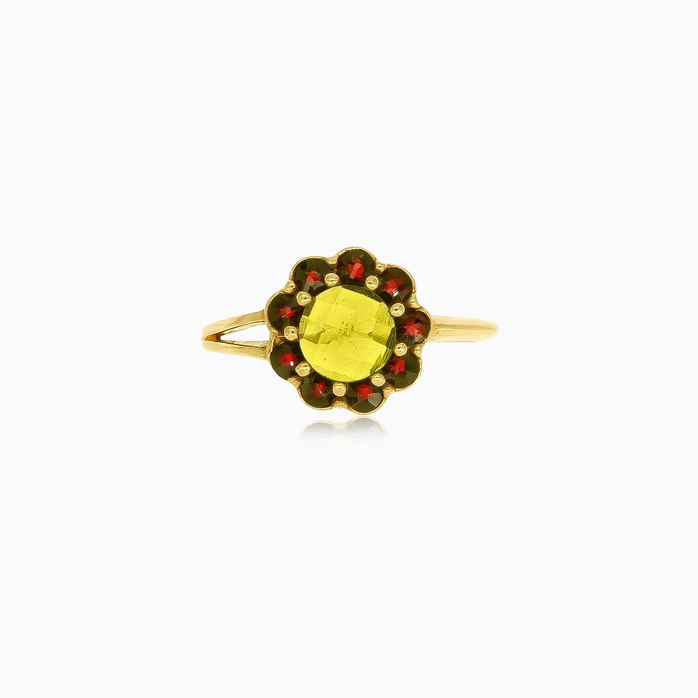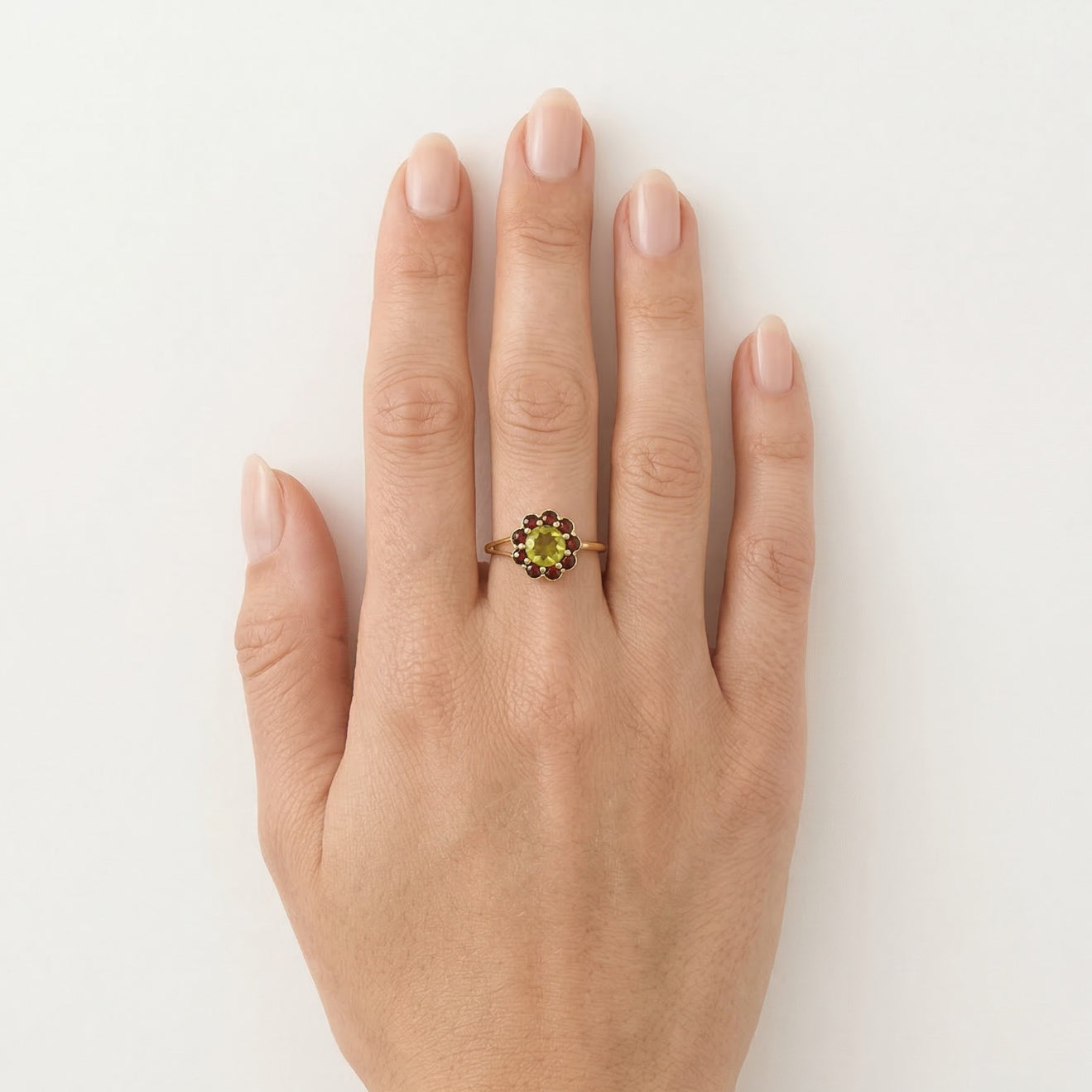 Anillo floral para mujer con moldavita y granate