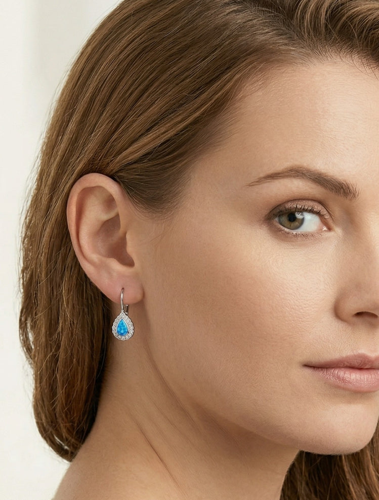 Pendientes pera de ópalo azul de pasta, hechos de plata de ley y combinados con un halo de circonitas cúbicas.