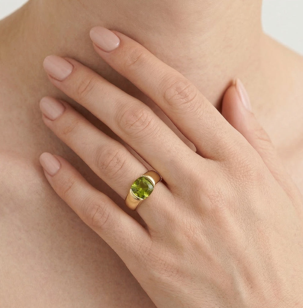 Eleva tu estilo con este anillo unisex de oro amarillo de 14 quilates, con una hipnotizante moldavita talla cojín con corte escalonado fino. El engaste semi biselado aporta un toque de modernidad, creando un accesorio único y atemporal para cualquier ocasión.