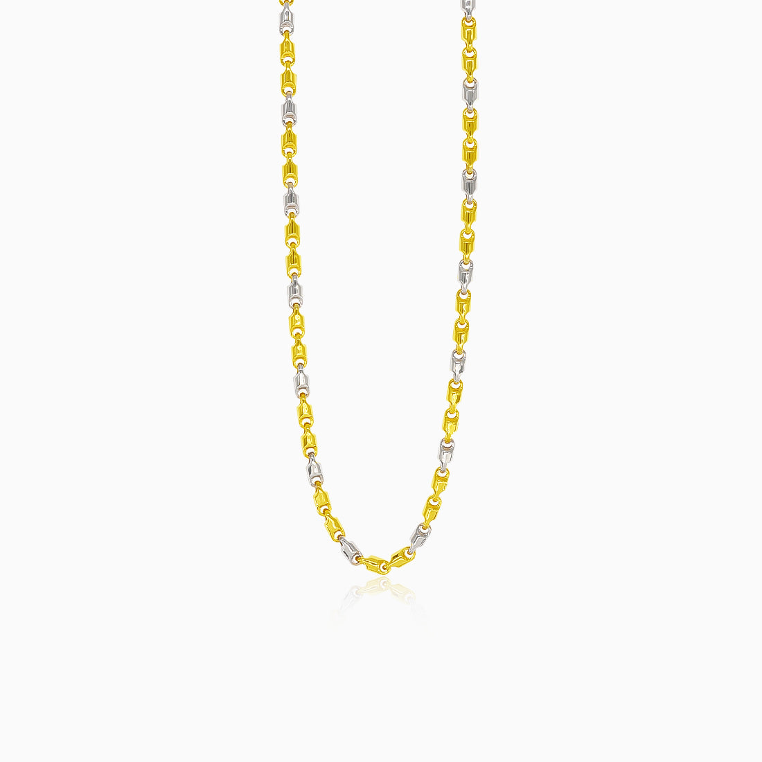Elegante collar cilíndrico bicolor de oro de 14 quilates que combina oro blanco y amarillo. Cuenta con un cierre seguro de mosquetón.