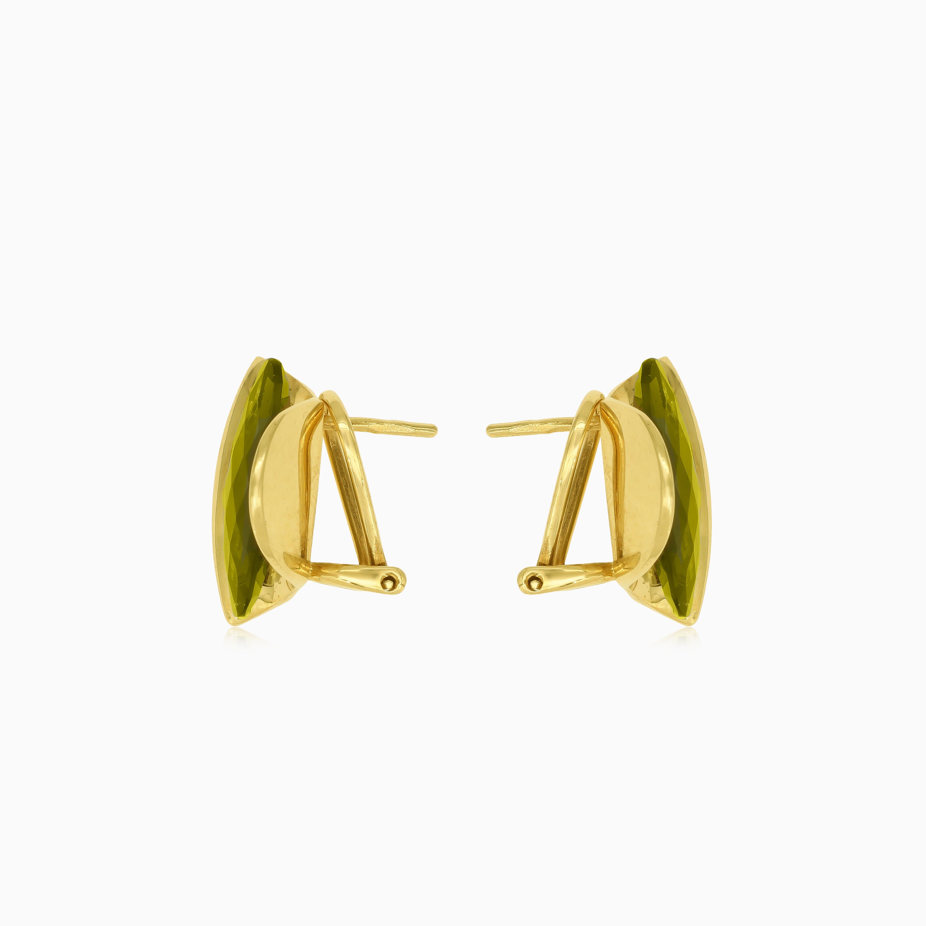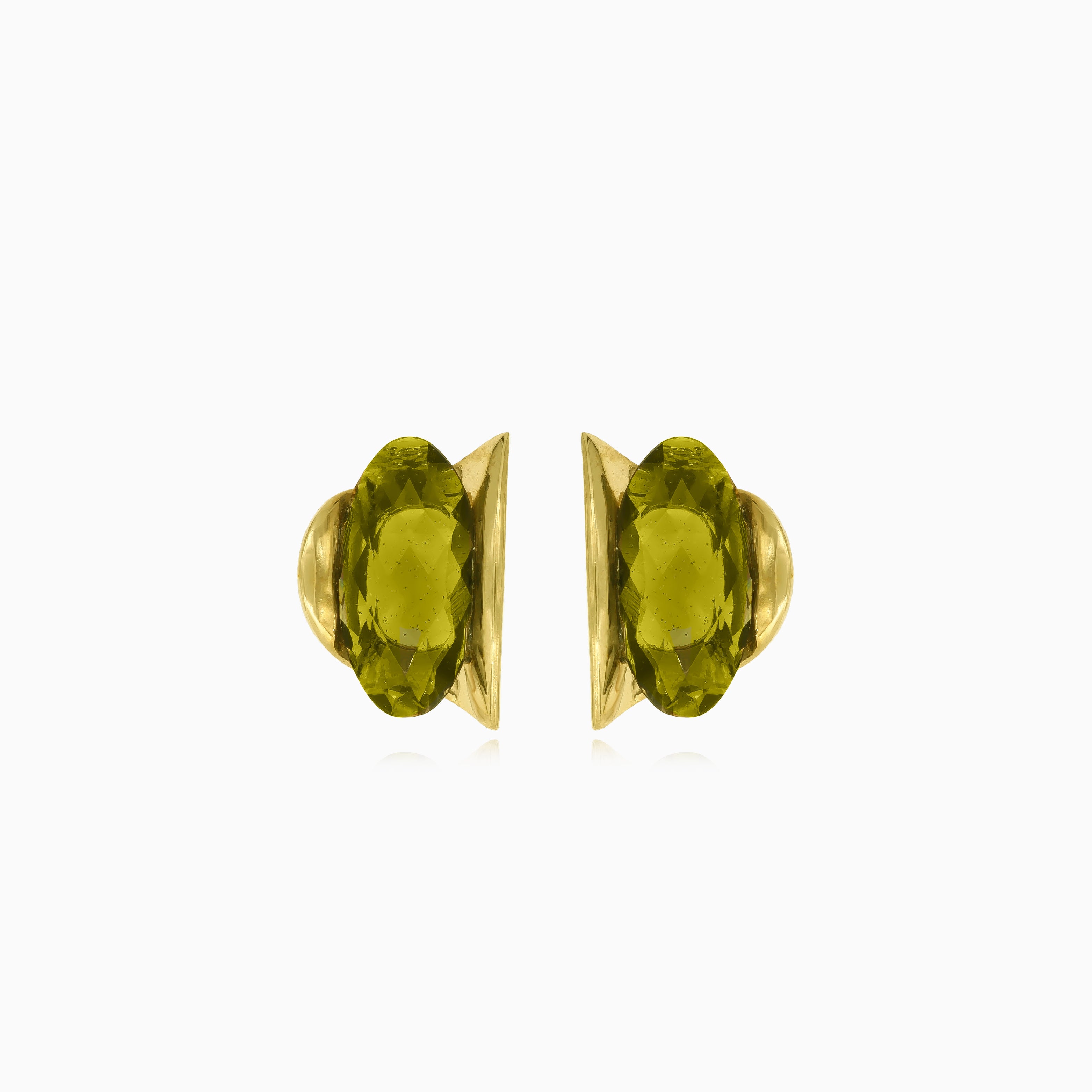 Eleva tu estilo con estos exquisitos pendientes de oro amarillo de 14 quilates con piedras de moldavita ovaladas de corte escalonado fino. Las gemas verdes se muestran elegantemente en un ajuste en barra con cierre omega, creando un accesorio sofisticado y cautivador.