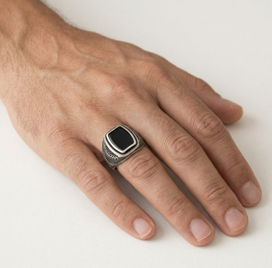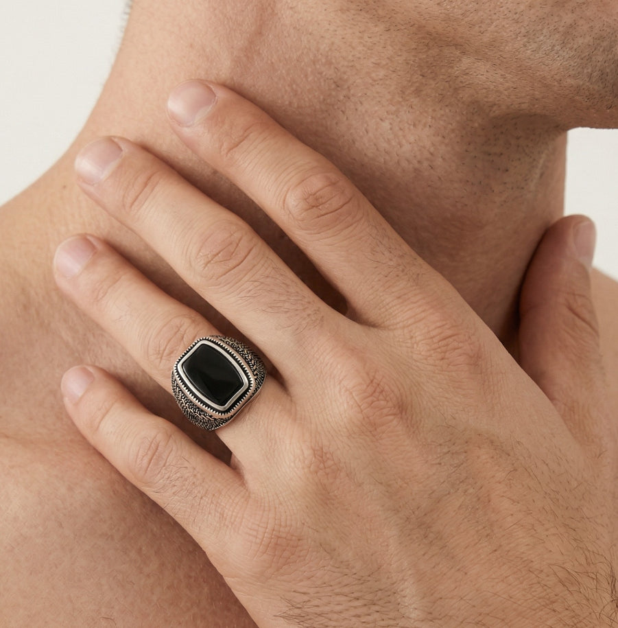 Pánský stříbrný prsten s onyxem, radiant a ryté boky