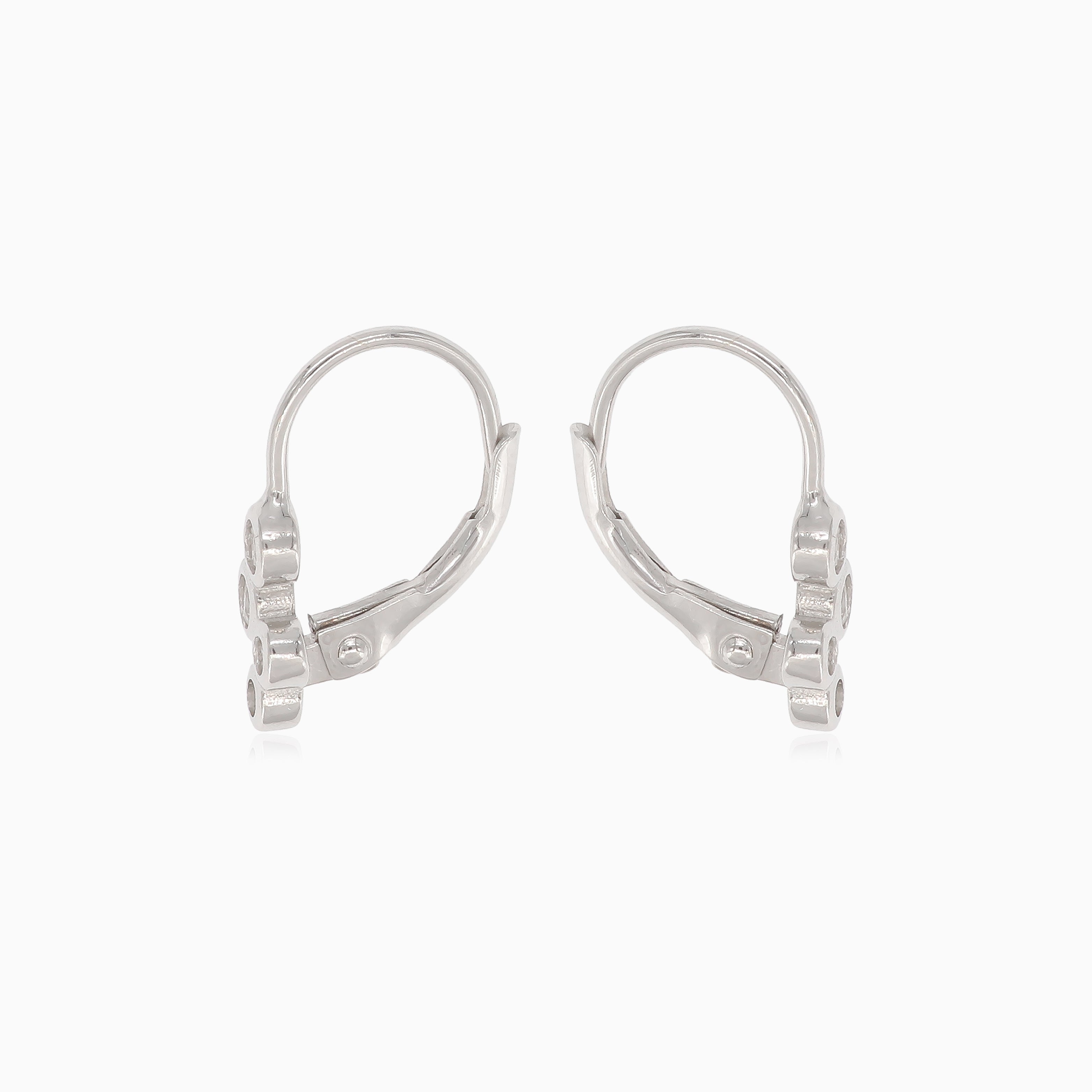 Adorna tus orejas con estos encantadores pendientes colgantes de plata con cuatro relucientes bolas de circonitas, asegurados con prácticos cierres tipo palanca para una comodidad duradera durante todo el día.