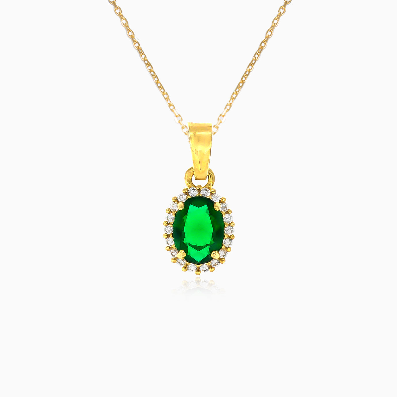 Colgante real en oro de 14 k con esmeralda sintética corte ovalado, rodeada de circonitas cúbicas corte redondo, que irradia encanto real.