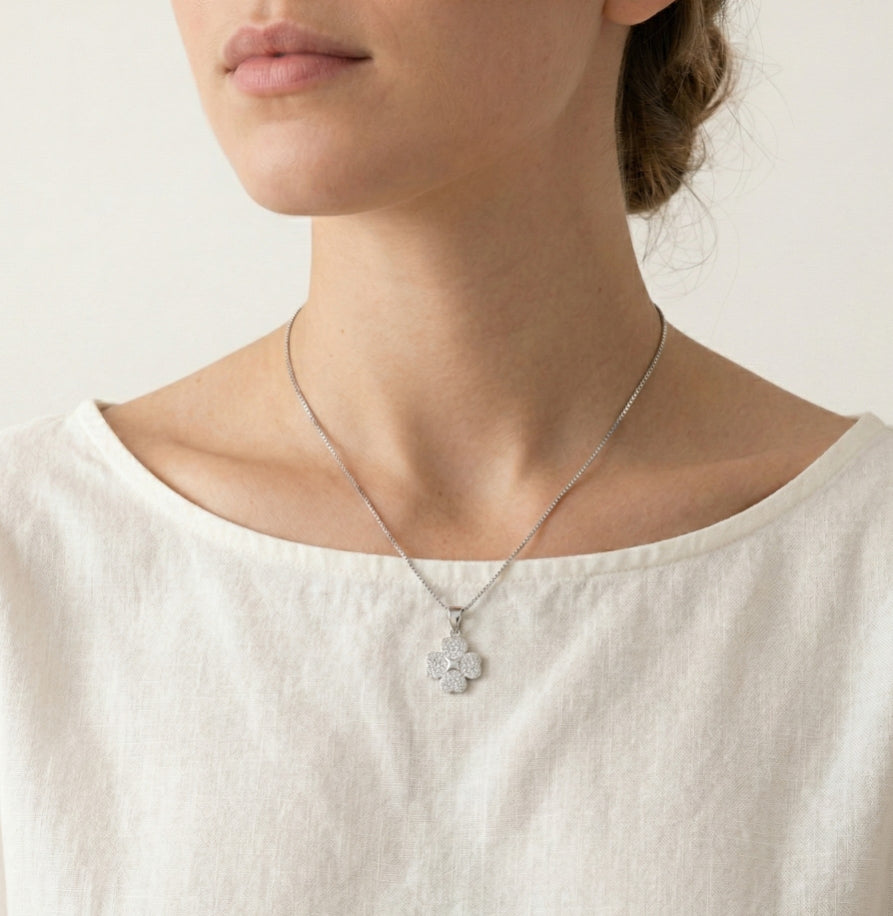 El colgante trébol pavé es una versión moderna del tradicional colgante trébol, combinado con circonitas blancas engastadas en pavé.