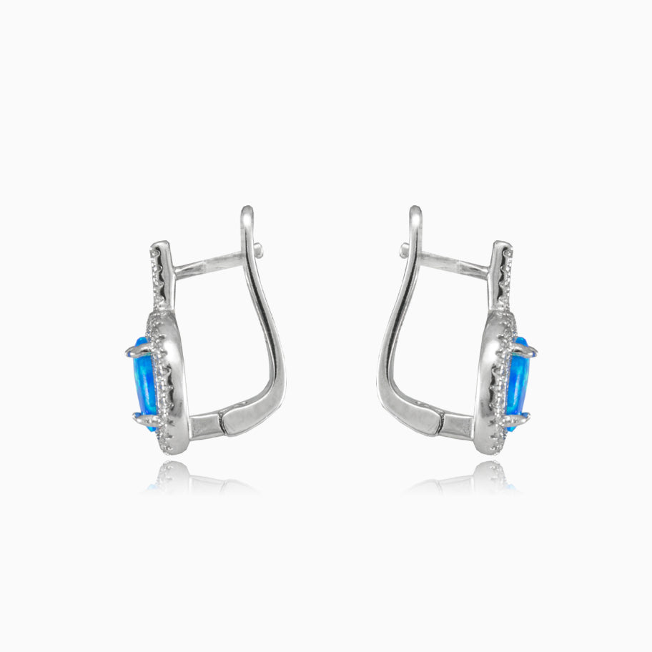 Pendientes de plata de ley para mujer combinados con ópalo azul de talla ovalada y halo de circonita cúbica con caída en línea.