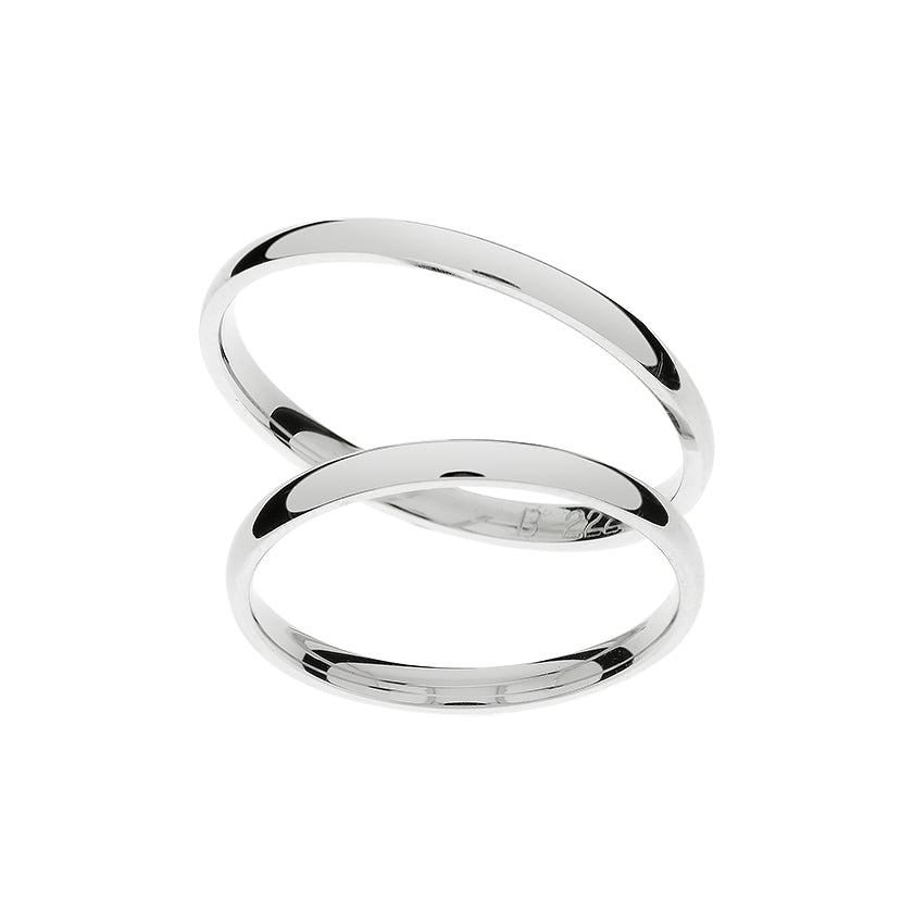 Anillos de boda atemporales y elegantes para hombres y mujeres en oro blanco de 14kt. Estos anillos presentan un acabado pulido de alta calidad y un diseño clásico con bordes redondeados. Con un grosor de 2 mm, ofrecen un look refinado, perfecto para cualquier pareja que busque un toque sofisticado.