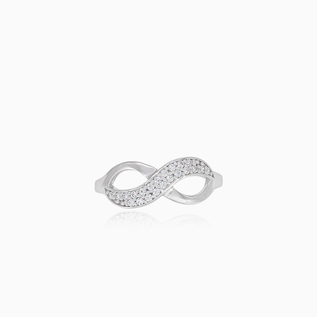 Este impresionante anillo infinito de oro blanco de 14 quilates está adornado con circonitas cúbicas redondas de talla escalonada fina, engastadas en garras. El símbolo del infinito representa el amor eterno y la eternidad, lo que convierte a este anillo en una incorporación significativa a cualquier colección de joyas. Perfecto para ocasiones especiales o para uso diario.