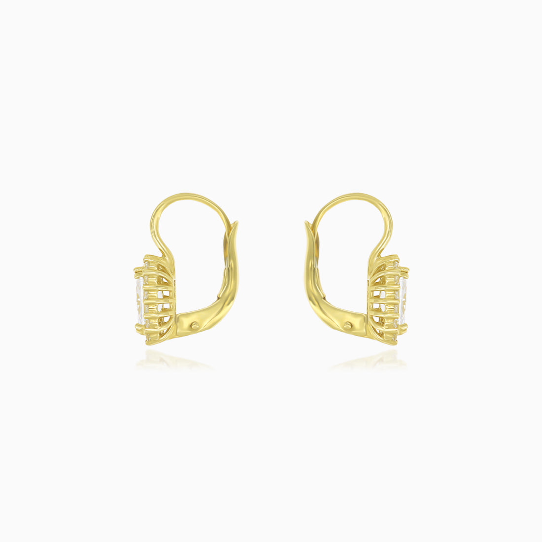 Pendientes de gota para mujer en oro amarillo de 14 quilates con circonitas cúbicas en un deslumbrante corte escalonado esmeralda en el centro, rodeadas de piedras redondas en corte escalonado fino. Diseñados con un engaste de garras y cierre de palanca seguro, estos pendientes irradian elegancia real, perfectos para ocasiones formales.