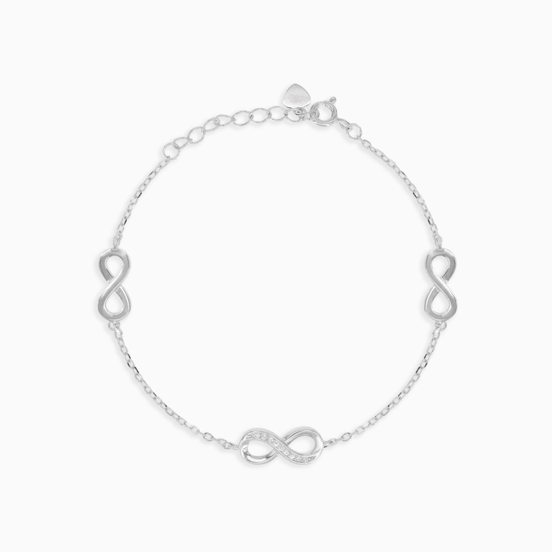Esta pulsera de cadena de plata de ley presenta tres elegantes símbolos de infinito, uno de ellos destacado con circonita cúbica brillante en corte fino redondo y engaste de garra seguro. El cierre de anillo de resorte garantiza un ajuste cómodo y seguro, perfecto para uso diario o ocasiones especiales.
