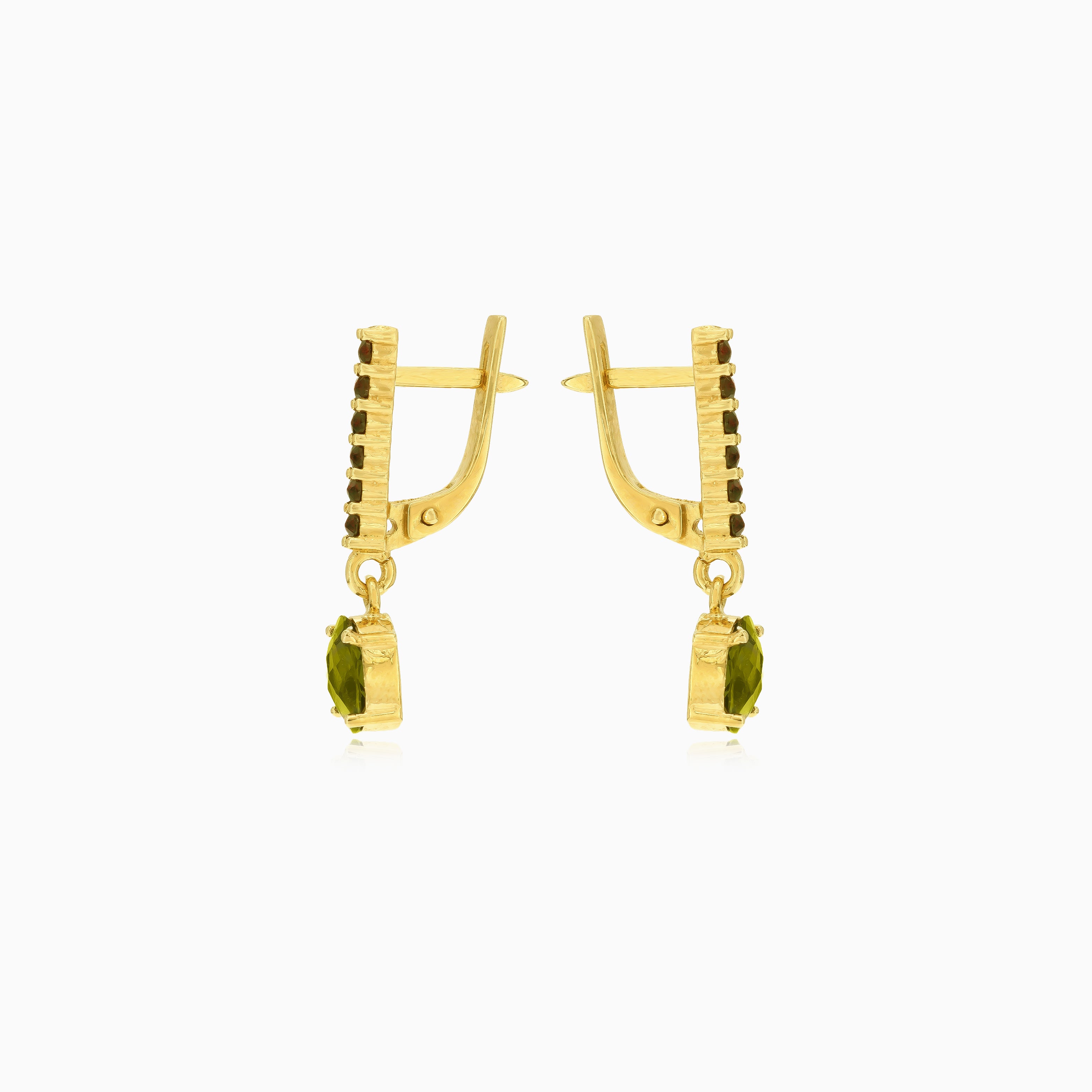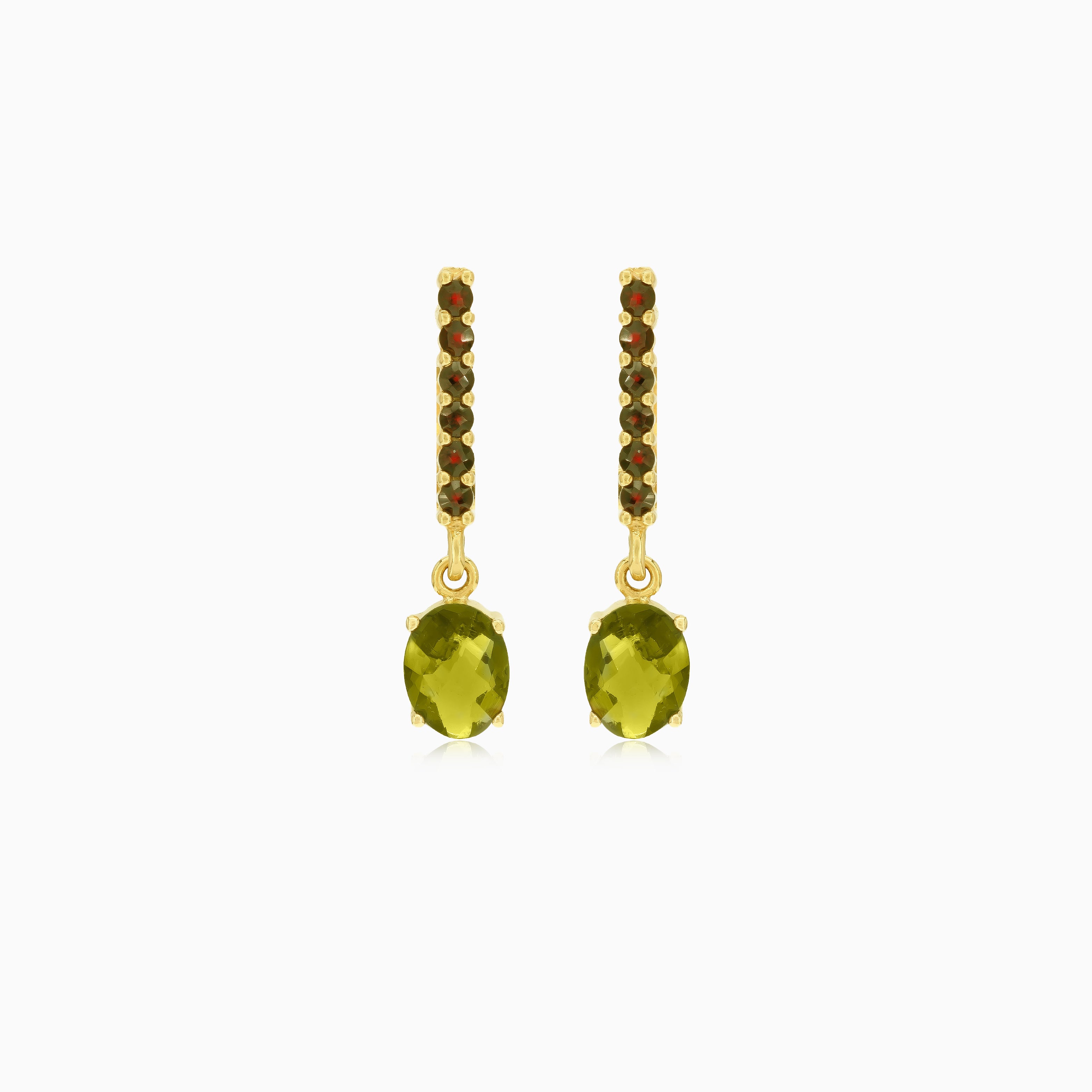 Sumérgete en el atractivo de estos pendientes colgantes de oro amarillo de 14 quilates, que presentan una cautivadora moldavita en corte oval fino paso a paso y un granate complementario en corte redondo fino paso a paso. El cierre de seguridad tipo bisagra y el elegante engaste en barra añaden sofisticación a este par celestial.