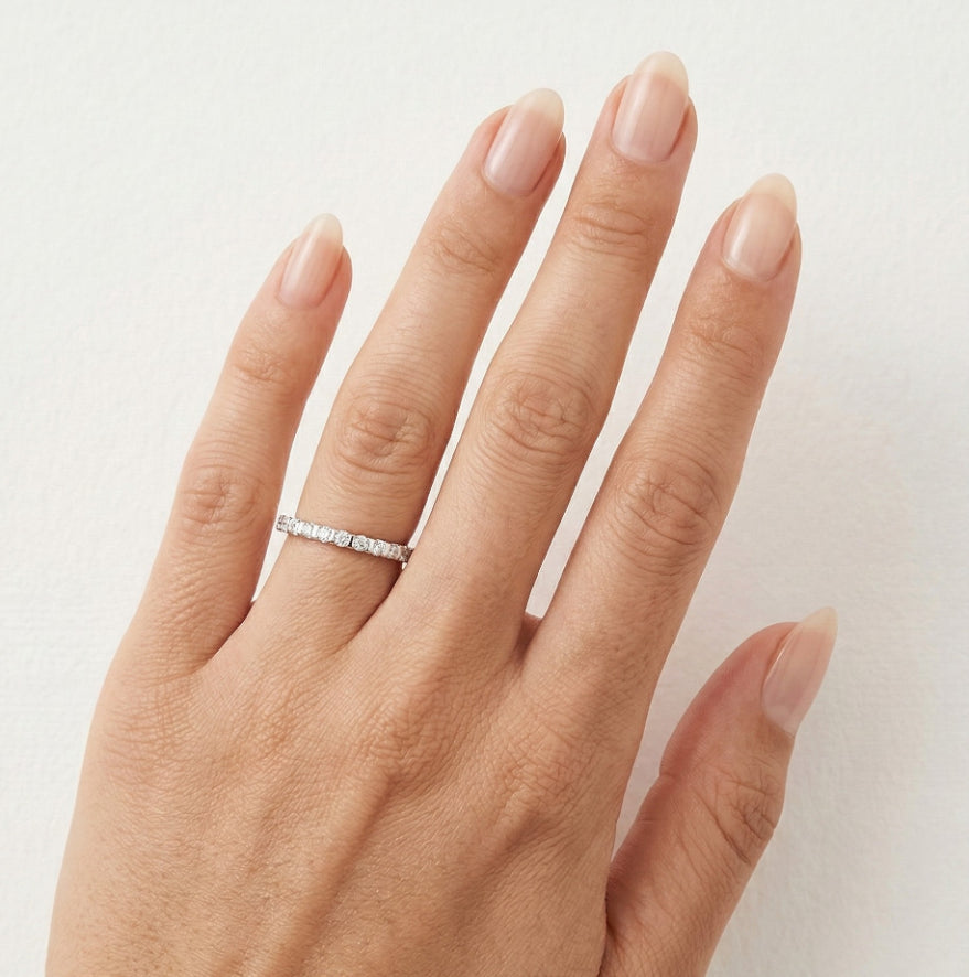 Brillante alianza de boda de oro blanco de 14 quilates para mujer, con un diseño delgado y media eternidad. Adornada con 0,14 ct de piedras opcionales, a elegir entre circonitas cúbicas o diamantes. Las piedras redondas de talla fina escalonada están engastadas en un engaste de barra, ofreciendo un aspecto delicado y refinado.