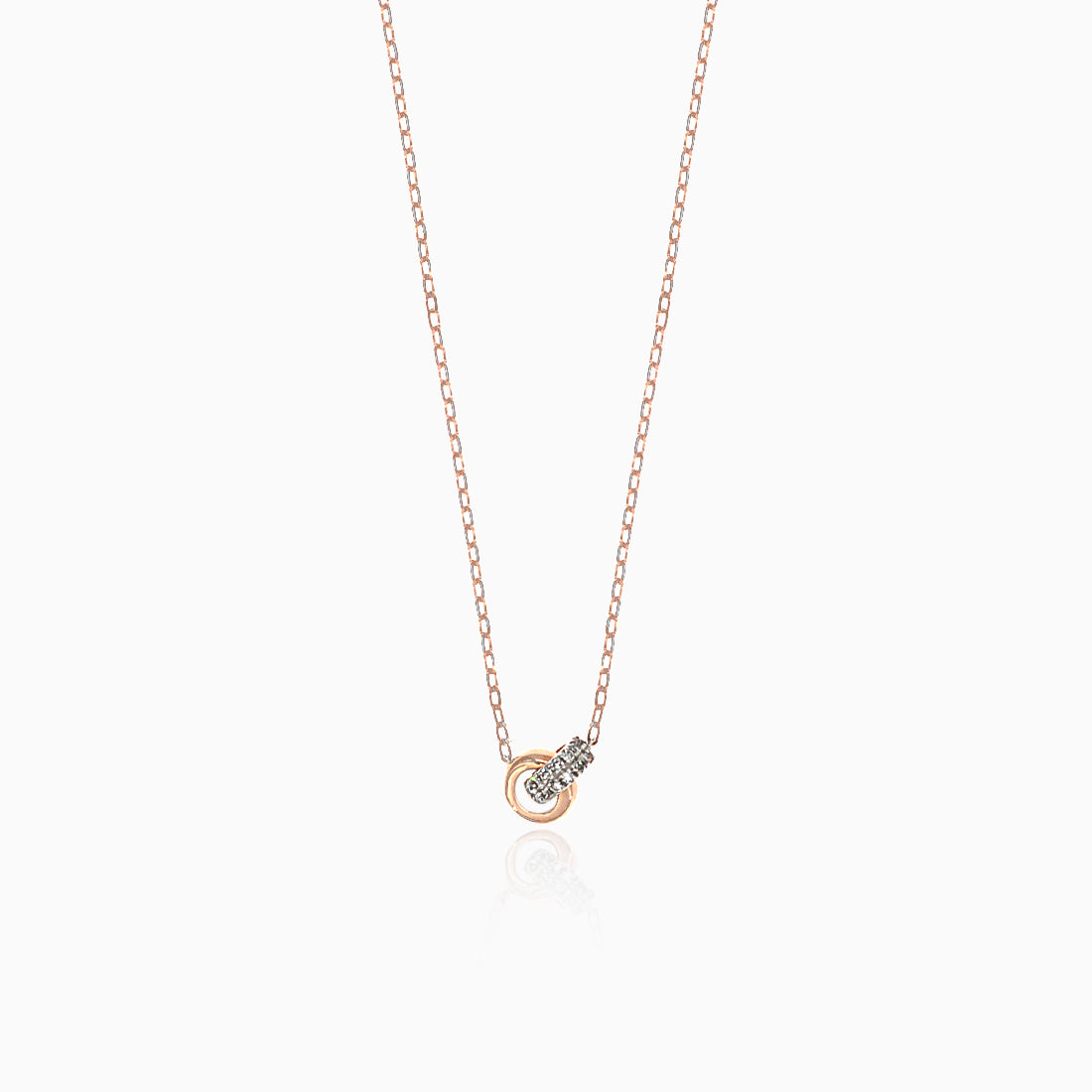 Confeccionado en oro rosa de 14 quilates, este collar único presenta dos anillos entrelazados. Un anillo está adornado con diamantes de corte brillante que totalizan 0,12 ct, engastados en garras compartidas. Estos diamantes tienen un color H y una claridad SI1. Un cierre de anillo de resorte asegura un uso fácil y seguro.