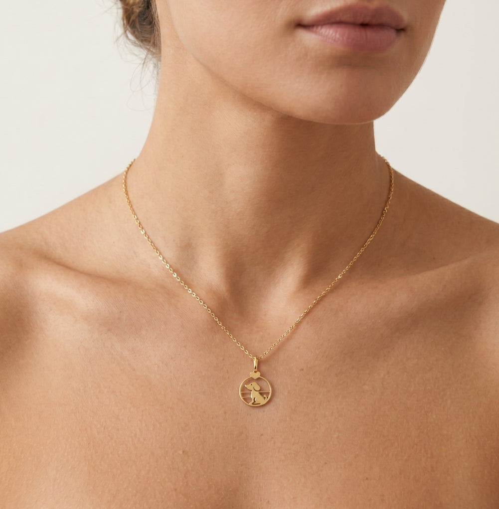 Este colgante minimalista presenta un perro elaborado en oro amarillo de 14 quilates. El perro se encuentra dentro de un círculo, con un corazón sobre su cabeza, del cual se extiende un anillo para colgarlo. La cadena no está incluida.