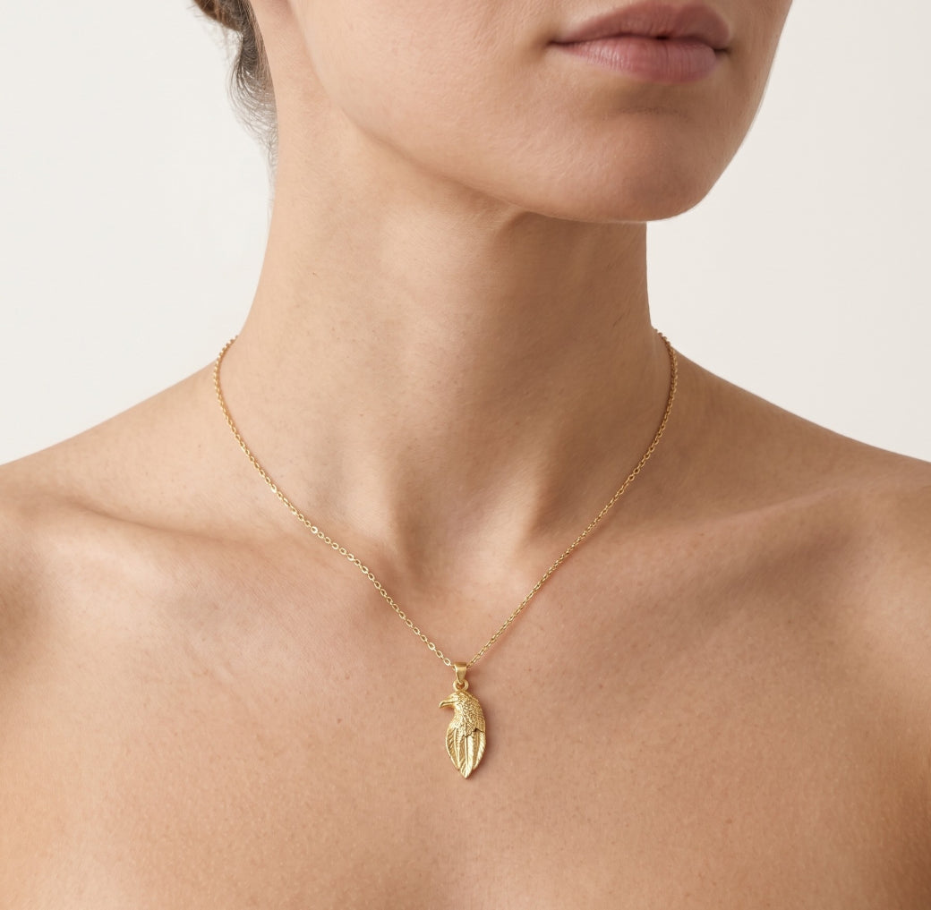 Este delicado colgante de cabeza de águila está hecho de oro amarillo de 14 quilates. El colgante está detallado para mostrar la estructura individual de las plumas, lo que lo convierte en un excelente regalo tanto para hombres como para mujeres.