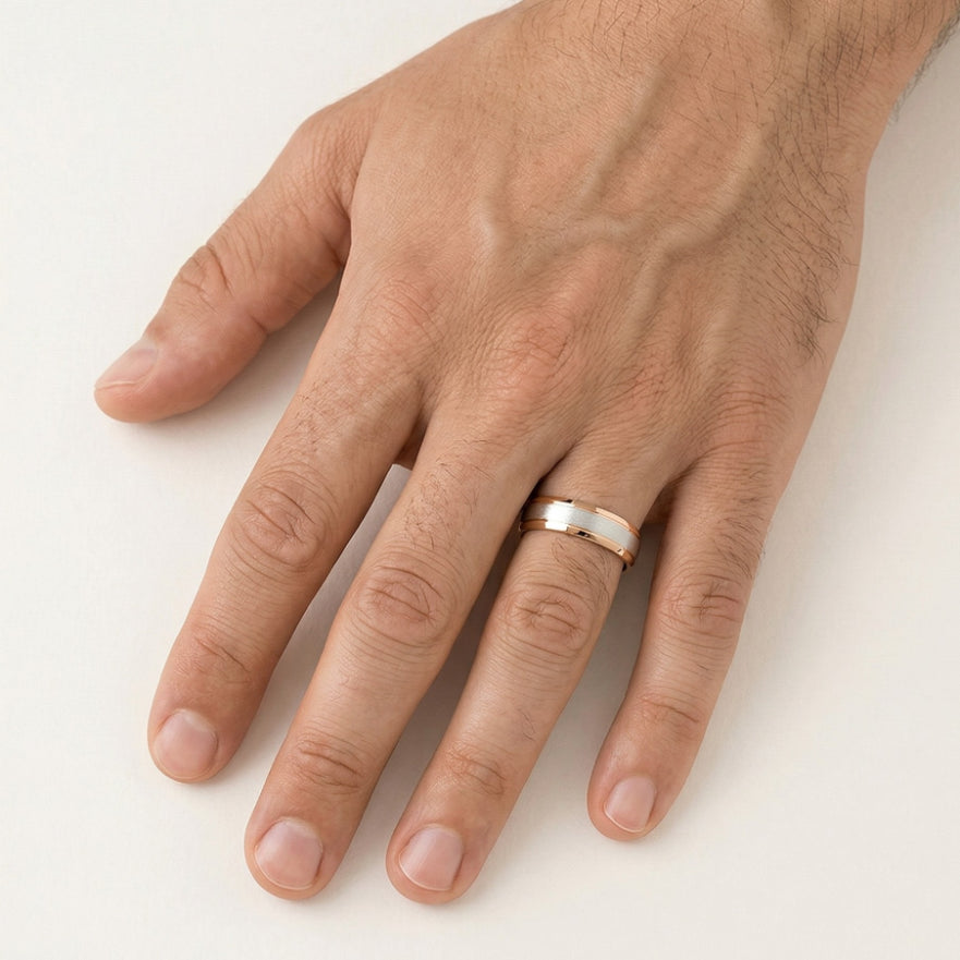 Este anillo de boda en oro rosa y blanco de 14 quilates, diseñado tanto para mujeres como para hombres, presenta una banda de 5 mm con detalles en oro rosa y oro blanco mate. Puedes elegir entre una banda lisa o una adornada con un solitario de zirconia cúbica de corte fino y 0.01ct o un diamante, montado en un engaste de bisel, creando un diseño atemporal y elegante.
