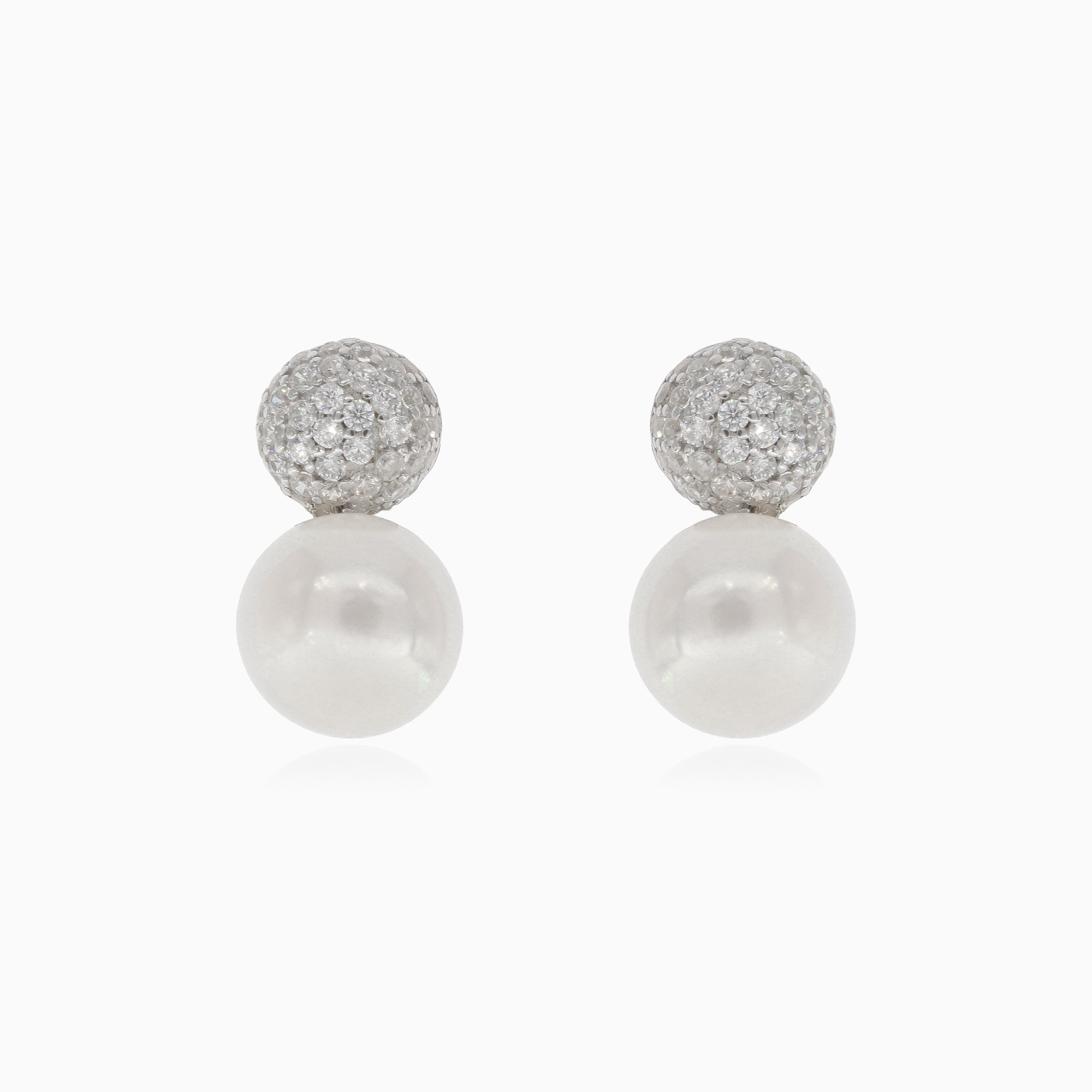 Adorna tus orejas con elegancia con estos pendientes colgantes de plata que presentan una perla lustrosa combinada con una deslumbrante bola de circonita cúbica para mayor sofisticación y brillo.