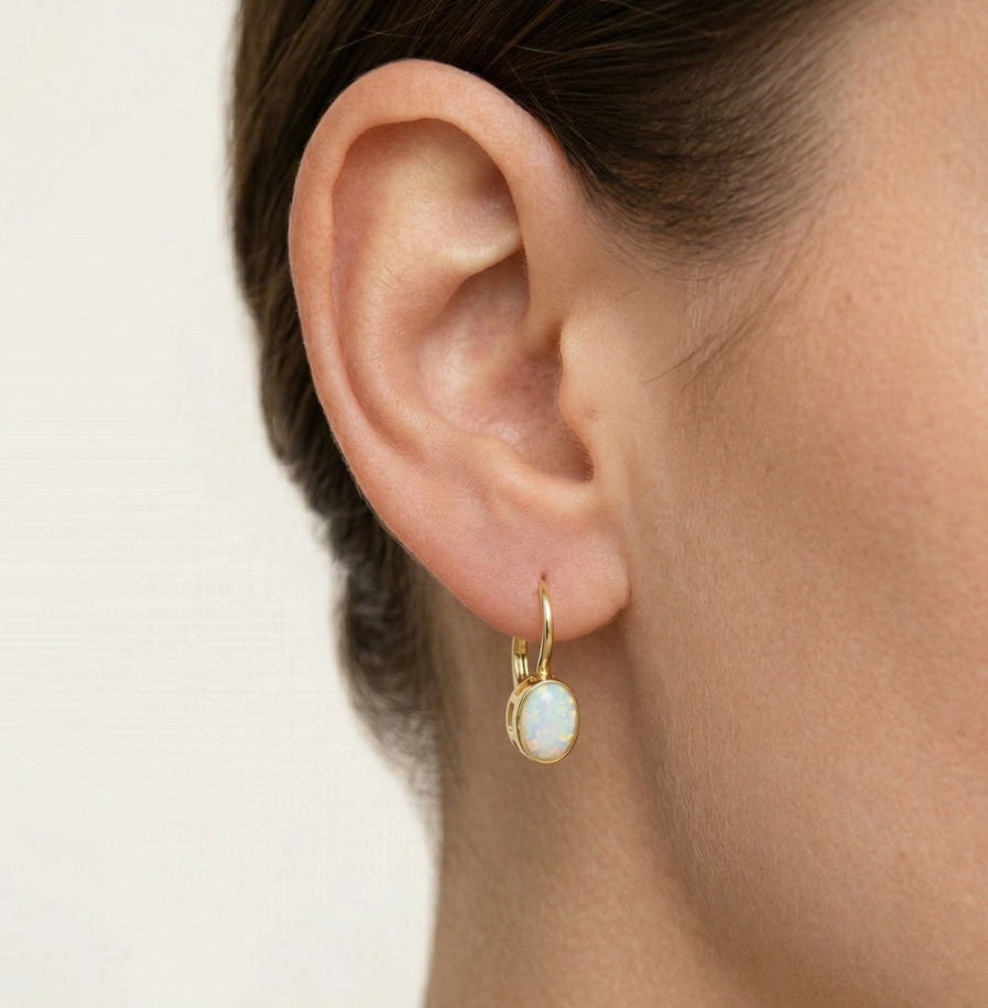 Pendientes de gota simples de oro amarillo de 14 quilates, combinados con ópalo blanco talla oval en engaste de bisel.