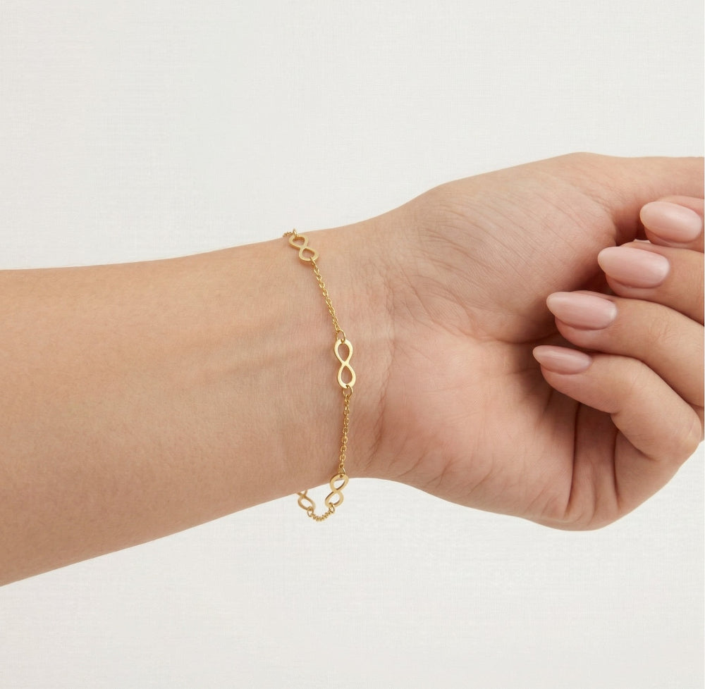 Eleva tu estilo con este sencillo pero elegante brazalete de oro de 14ct que presenta múltiples patrones de infinito. El brazalete se asegura con un cierre de langosta.