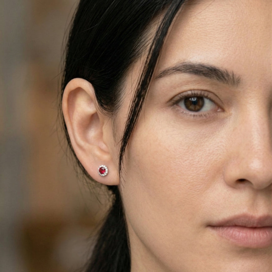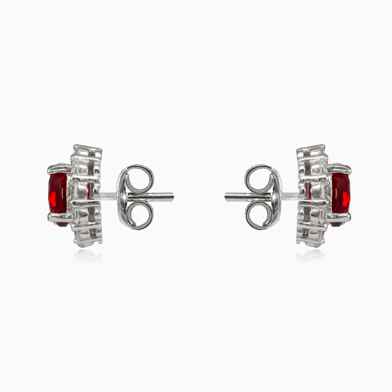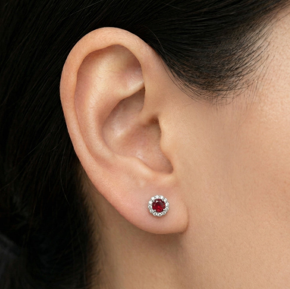 Pendientes halo brillantes de plata de ley combinados con cuarzo rojo central redondo y un halo de circonitas alrededor.