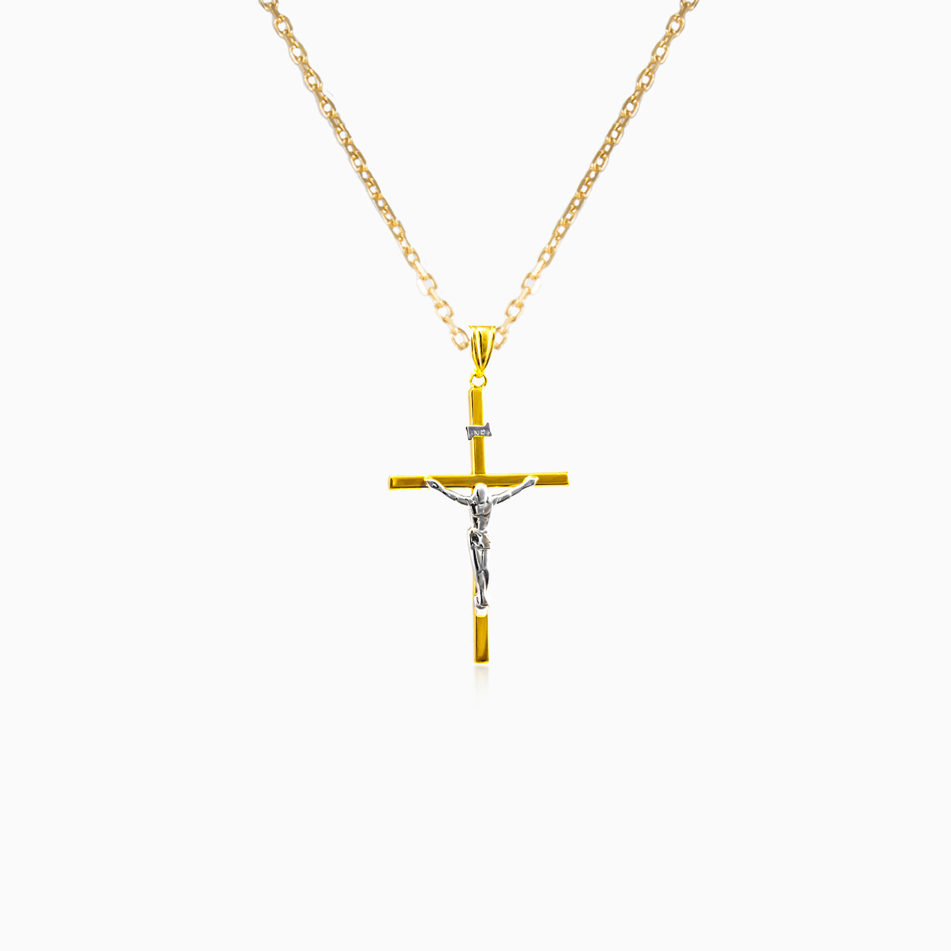 Este colgante presenta un diseño simple y delicado, mostrando una cruz delgada de oro amarillo y blanco de 14kt con una imagen de Jesucristo.
