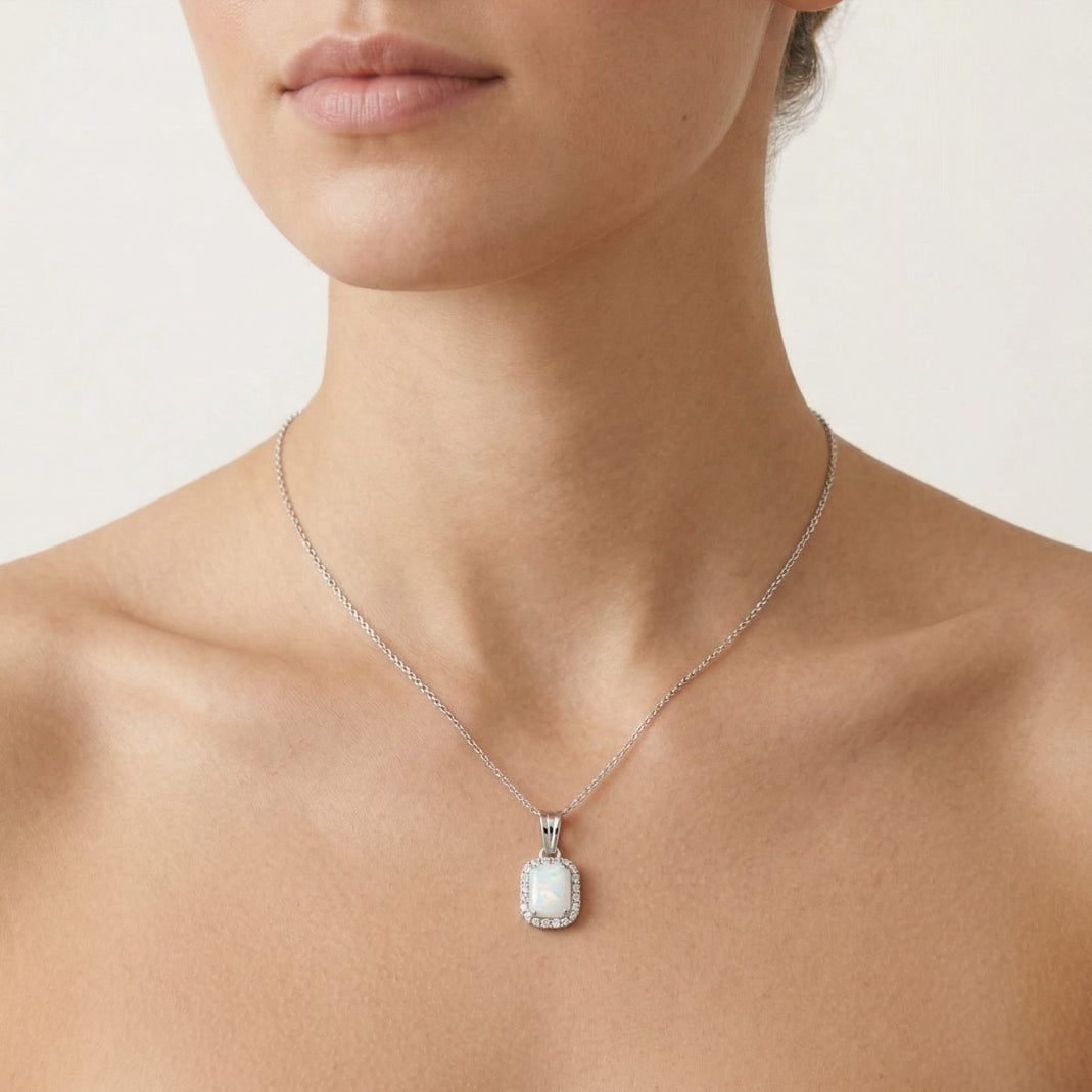 Hermoso colgante clásico en oro blanco de 14 quilates con un halo de circonitas cúbicas redondas que rodean un ópalo cabujón rectangular.