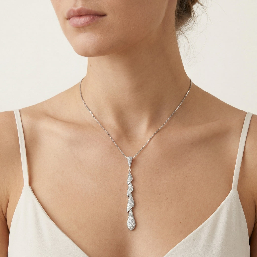 Elegante colgante largo de plata de ley con pavé de circonitas blancas.