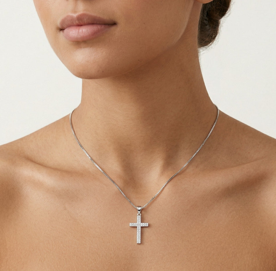Péndulo de cruz de plata de ley combinado con dos líneas de circonitas cúbicas.