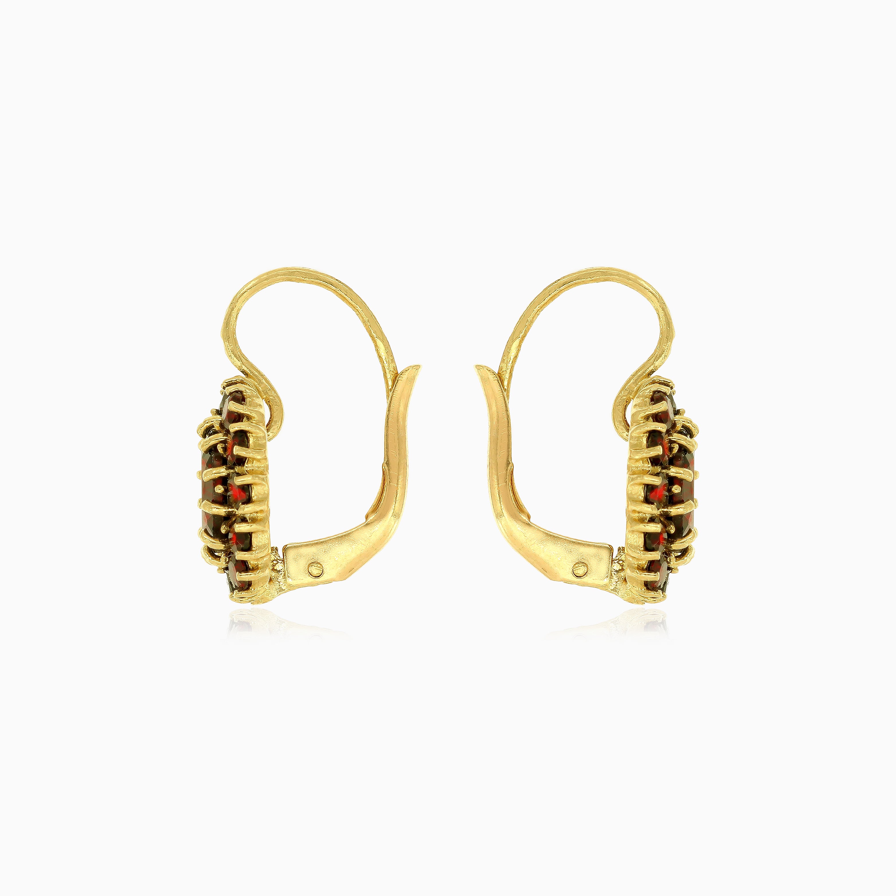 Eleva tu estilo con nuestros impresionantes pendientes colgantes de granate. Presentan un granate ovalado con talla escalonada fina, rodeado de piedras redondas con talla escalonada fina, todo engastado en un engaste de garras compartidas. Elaborados en lujoso oro amarillo de 14 quilates, con cierre de palanca para un uso seguro.