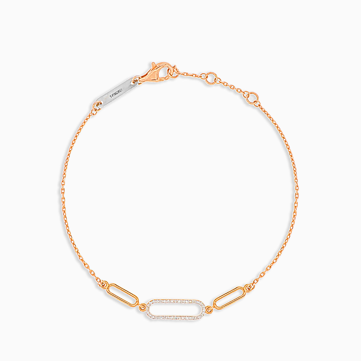 Esta impresionante pulsera está hecha de oro rosa de 14 quilates y presenta tres rectángulos redondeados. Dos pequeños y el del medio adornado con diamantes VS-SI G de 0,07 ct. La pulsera tiene un cierre de mosquetón y ofrece tres longitudes ajustables.