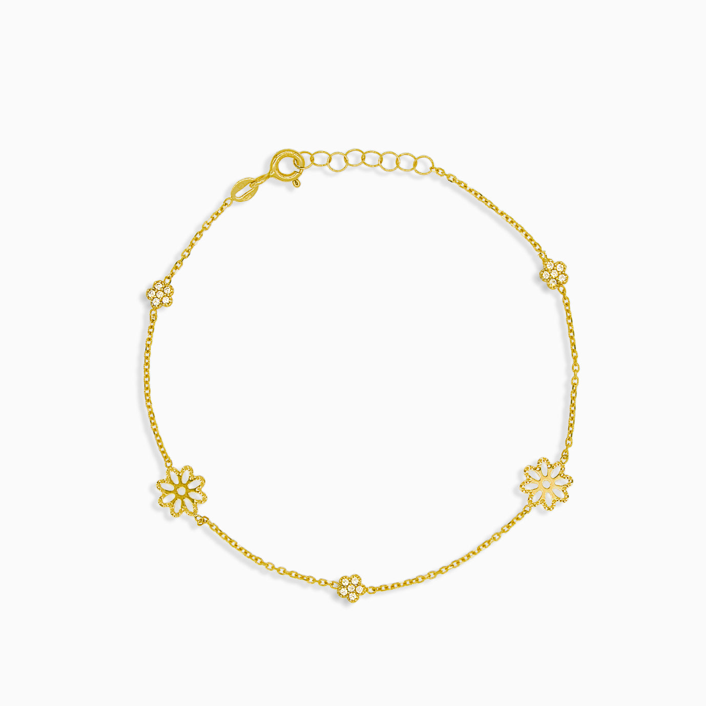 Este delicado brazalete de cadena en oro amarillo de 14 quilates presenta intrincados motivos florales elaborados con técnicas finas de orfebrería. El brazalete se asegura con un cierre de anillo de resorte para un uso sin esfuerzo.