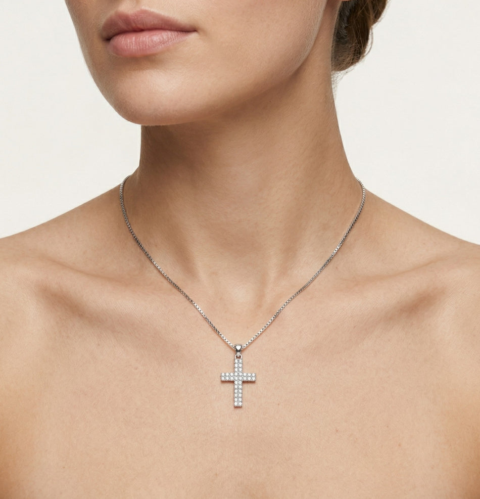 Péndulo de cruz de plata esterlina combinado con dos líneas de cristales.