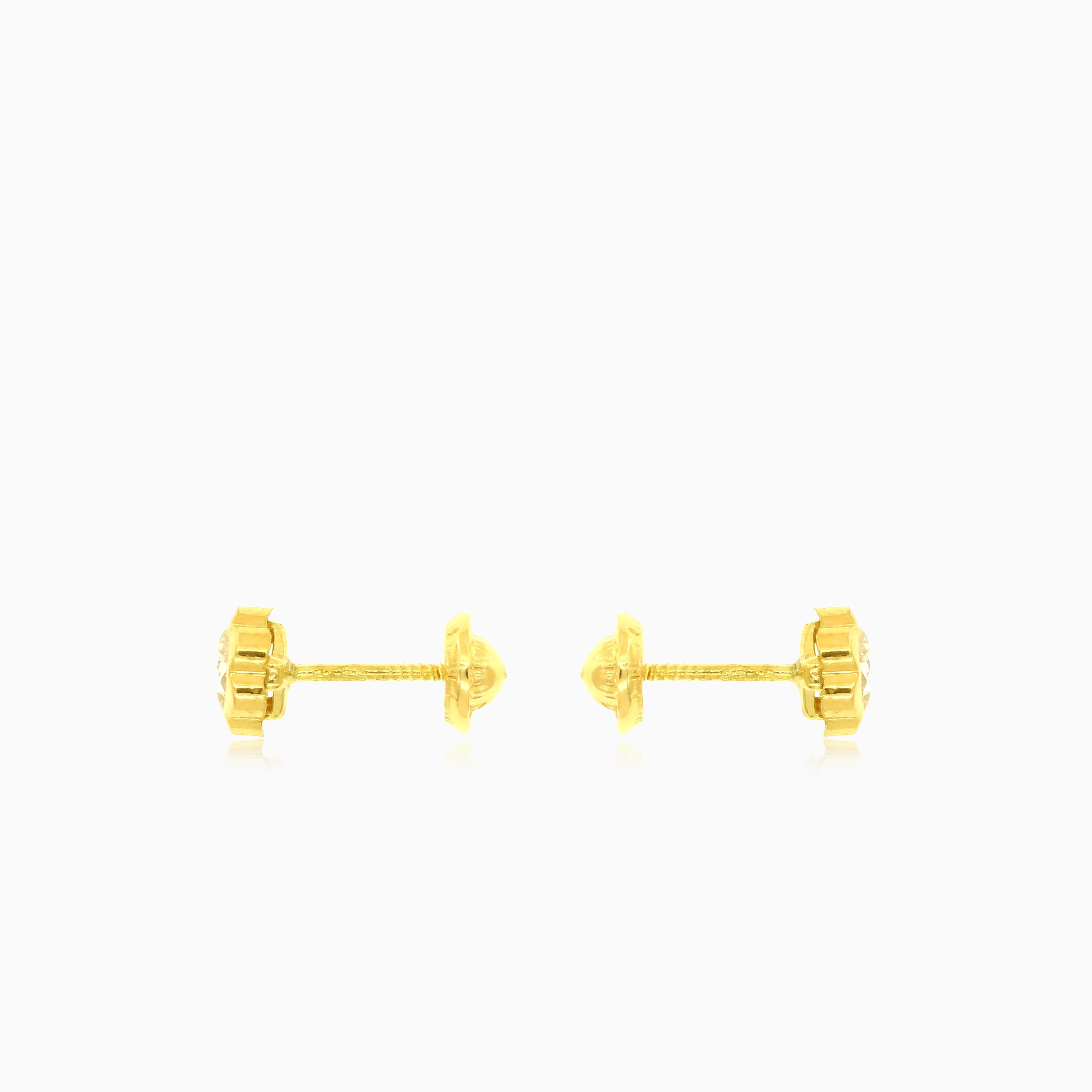 Pendientes distintivos de oro amarillo de 18 kt, adornados con circonitas cúbicas transparentes redondas y asegurados con un elegante cierre de rosca.